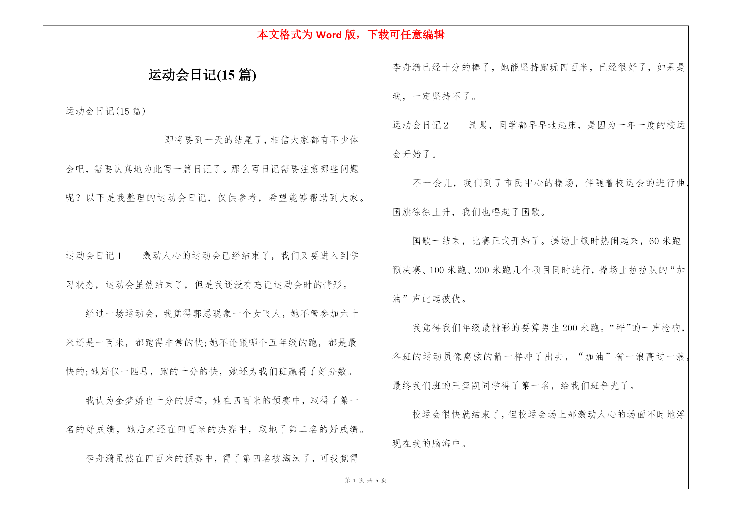 本文格式为Word版,下载可任意编辑第PAGE\*MERGEFORMAT6页共NUMPAGES\*MERGEFORMAT6页运动会日记(15篇)运动会日记(15篇)即将要到一天的结尾了,相信大家都有不少体会吧,需要认真地为此写一篇日记了。那么写日记需要注意哪些问题呢?以下是我整理的运动会日记,仅供参考,希望能够帮助到大家。运动会日记1激动人心的运动会已经结束了,我们又要进入到学习状态,运动会虽然结束了,但是我还没有忘记运动会时的情形。经过一场运动会,我觉得郭思聪象一个女飞人,她不管参加六十米还