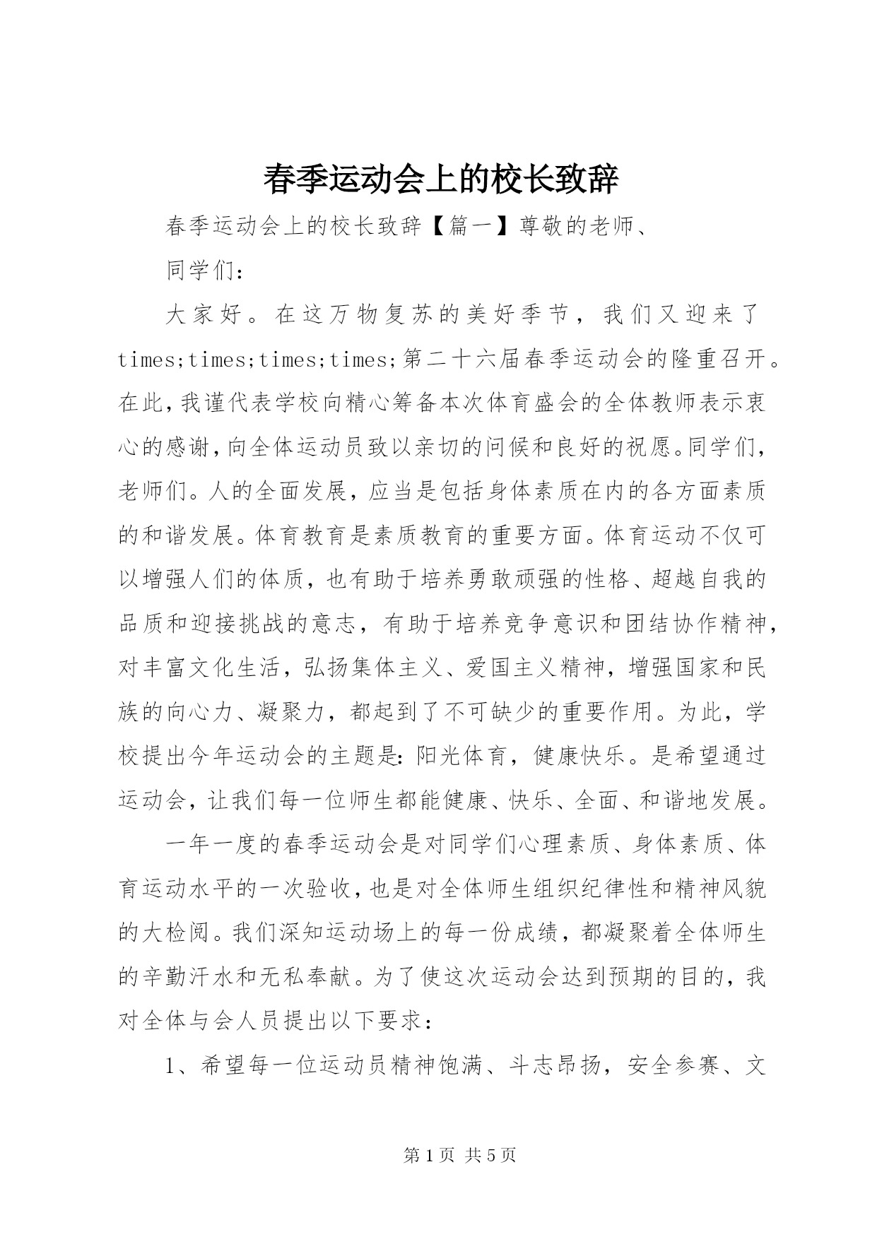 第PAGE\*Arabic\*MERGEFORMAT5页共NUMPAGES\*MERGEFORMAT5页春季运动会上的校长致辞春季运动会上的校长致辞【篇一】尊敬的老师、同学们:大家好。在这万物复苏的美好季节,我们又迎来了times;times;times;times;第二十六届春季运动会的隆重召开。在此,我谨代表学校向精心筹备本次体育盛会的全体教师表示衷心的感谢,向全体运动员致以亲切的问候和良好的祝愿。同学们,老师们。人的全面发展,应当是包括身体素质在内的各方面素质的和谐发展。体育教育是素质教