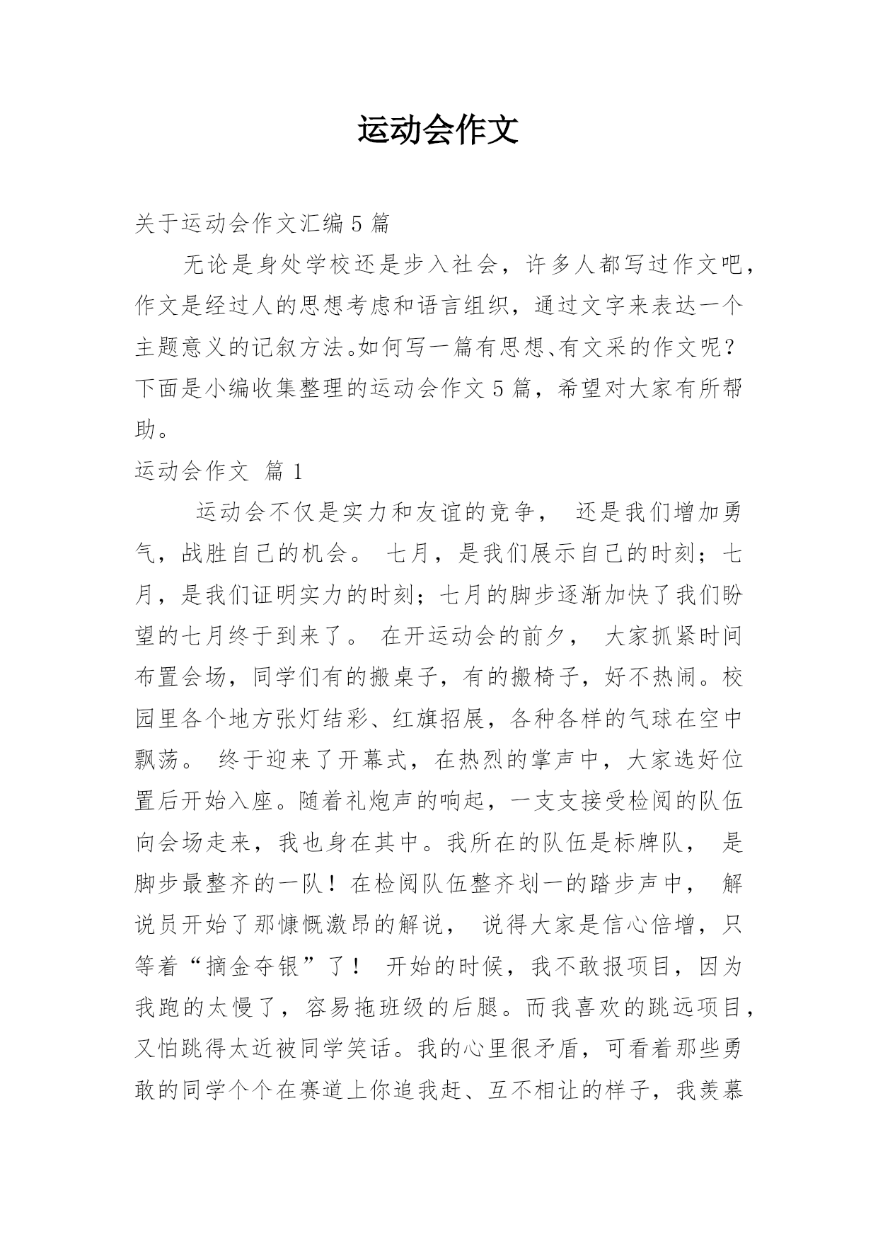 运动会作文关于运动会作文汇编5篇无论是身处学校还是步入社会,许多人都写过作文吧,作文是经过人的思想考虑和语言组织,通过文字来表达一个主题意义的记叙方法。如何写一篇有思想、有文采的作文呢?下面是小编收集整理的运动会作文5篇,希望对大家有所帮助。运动会作文篇1运动会不仅是实力和友谊的竞争,还是我们增加勇气,战胜自己的机会。七月,是我们展示自己的时刻;七月,是我们证明实力的时刻;七月的脚步逐渐加快了我们盼望的七月终于到来了。在开运动会的前夕,大家抓紧时间布置会场,同学们有的搬桌子,有的搬椅子,好不热闹。校园里各