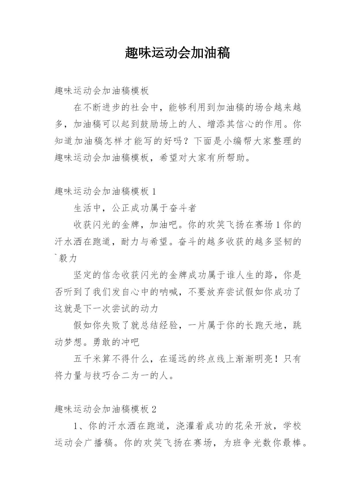 趣味运动会加油稿趣味运动会加油稿模板在不断进步的社会中,能够利用到加油稿的场合越来越多,加油稿可以起到鼓励场上的人、增添其信心的作用。你知道加油稿怎样才能写的好吗?下面是小编帮大家整理的趣味运动会加油稿模板,希望对大家有所帮助。趣味运动会加油稿模板1生活中,公正成功属于奋斗者收获闪光的金牌,加油吧。你的欢笑飞扬在赛场1你的汗水洒在跑道,耐力与希望。奋斗的越多收获的越多坚韧的`毅力坚定的信念收获闪光的金牌成功属于谁人生的路,你是否听到了我们发自心中的呐喊,不要放弃尝试假如你成功了这就是下一次尝试的动力假如你