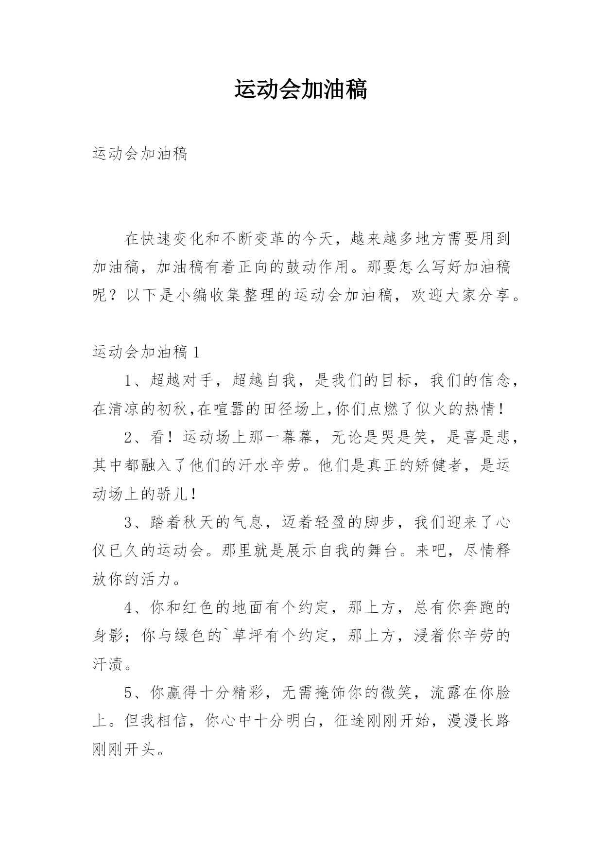 运动会加油稿运动会加油稿在快速变化和不断变革的今天,越来越多地方需要用到加油稿,加油稿有着正向的鼓动作用。那要怎么写好加油稿呢?以下是小编收集整理的运动会加油稿,欢迎大家分享。运动会加油稿11、超越对手,超越自我,是我们的目标,我们的信念,在清凉的初秋,在喧嚣的田径场上,你们点燃了似火的热情!2、看!运动场上那一幕幕,无论是哭是笑,是喜是悲,其中都融入了他们的汗水辛劳。他们是真正的矫健者,是运动场上的骄儿!3、踏着秋天的气息,迈着轻盈的脚步,我们迎来了心仪已久的运动会。那里就是展示自我的舞台。来吧,尽情释