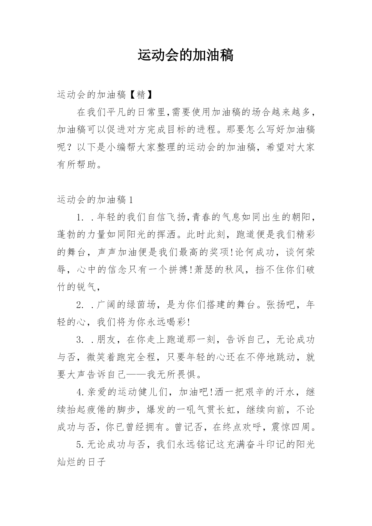 运动会的加油稿运动会的加油稿【精】在我们平凡的日常里,需要使用加油稿的场合越来越多,加油稿可以促进对方完成目标的进程。那要怎么写好加油稿呢?以下是小编帮大家整理的运动会的加油稿,希望对大家有所帮助。运动会的加油稿11..年轻的我们自信飞扬,青春的气息如同出生的朝阳,蓬勃的力量如同阳光的挥洒。此时此刻,跑道便是我们精彩的舞台,声声加油便是我们最高的奖项!论何成功,谈何荣辱,心中的信念只有一个拼搏!萧瑟的秋风,挡不住你们破竹的锐气,2..广阔的绿茵场,是为你们搭建的舞台。张扬吧,年轻的心,我们将为你永远喝彩!