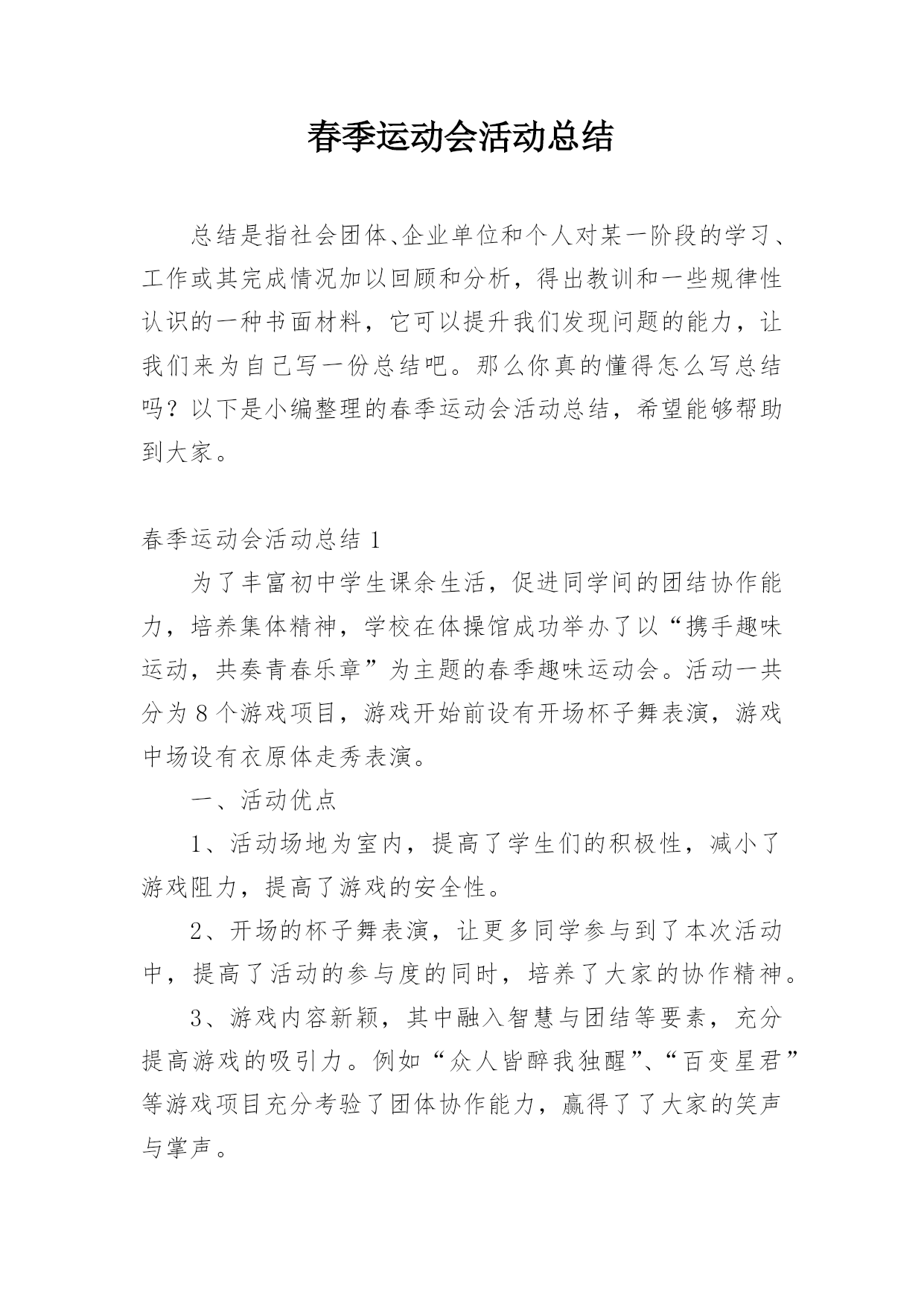 春季运动会活动总结总结是指社会团体、企业单位和个人对某一阶段的学习、工作或其完成情况加以回顾和分析,得出教训和一些规律性认识的一种书面材料,它可以提升我们发现问题的能力,让我们来为自己写一份总结吧。那么你真的懂得怎么写总结吗?以下是小编整理的春季运动会活动总结,希望能够帮助到大家。春季运动会活动总结1为了丰富初中学生课余生活,促进同学间的团结协作能力,培养集体精神,学校在体操馆成功举办了以“携手趣味运动,共奏青春乐章”为主题的春季趣味运动会。活动一共分为8个游戏项目,游戏开始前设有开场杯子舞表演,游戏中场