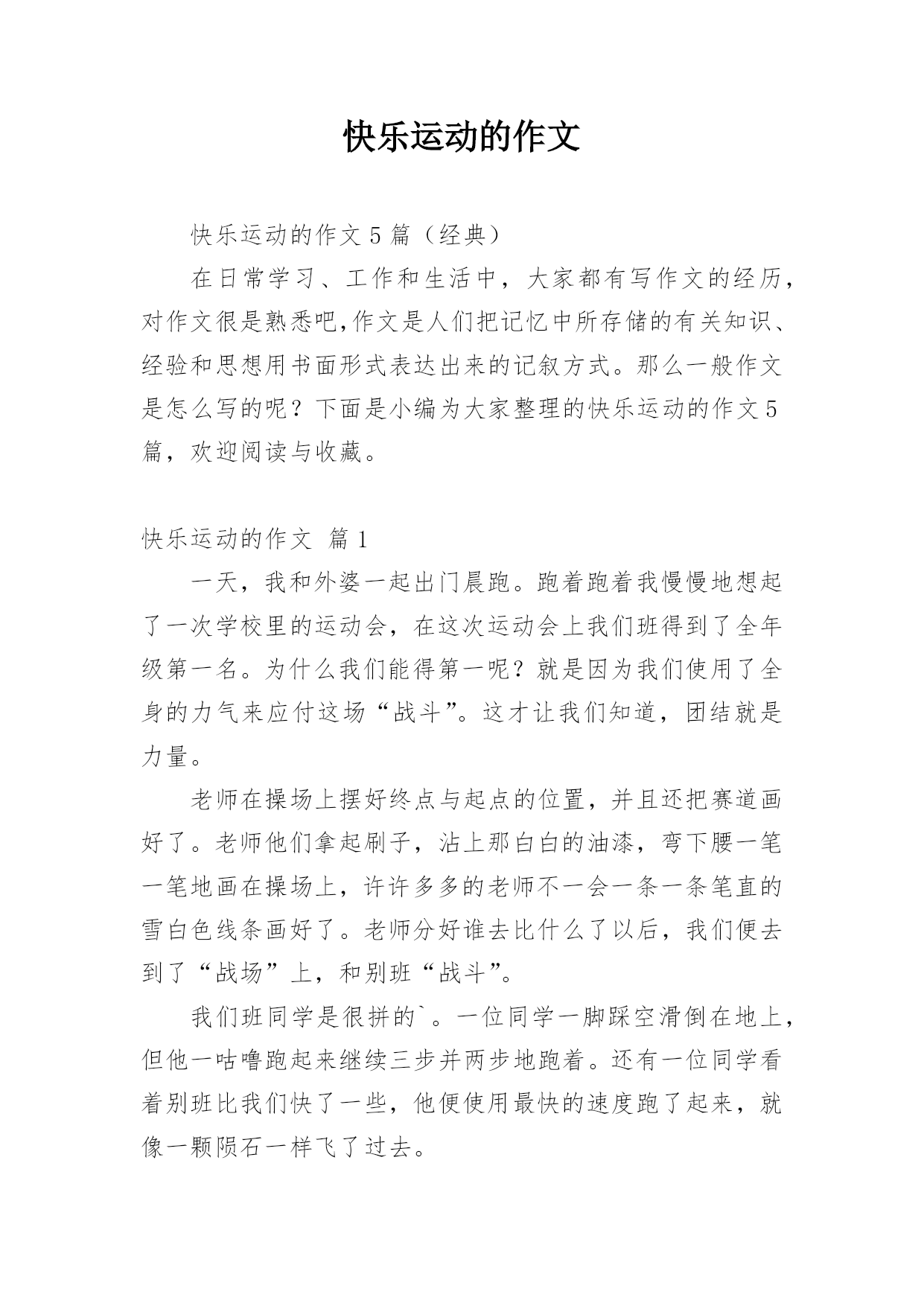 快乐运动的作文快乐运动的作文5篇(经典)在日常学习、工作和生活中,大家都有写作文的经历,对作文很是熟悉吧,作文是人们把记忆中所存储的有关知识、经验和思想用书面形式表达出来的记叙方式。那么一般作文是怎么写的呢?下面是小编为大家整理的快乐运动的作文5篇,欢迎阅读与收藏。快乐运动的作文篇1一天,我和外婆一起出门晨跑。跑着跑着我慢慢地想起了一次学校里的运动会,在这次运动会上我们班得到了全年级第一名。为什么我们能得第一呢?就是因为我们使用了全身的力气来应付这场“战斗”。这才让我们知道,团结就是力量。老师在操场上摆好