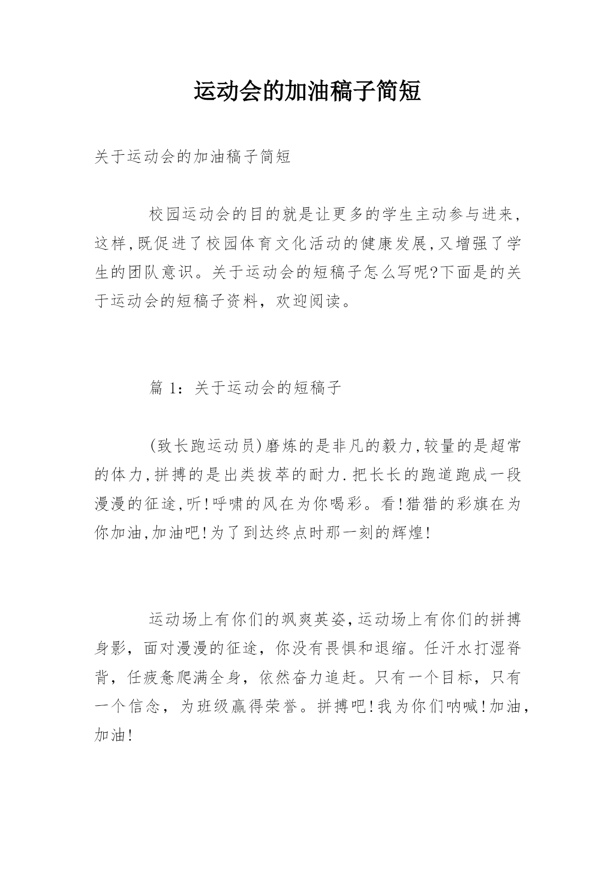 运动会的加油稿子简短关于运动会的加油稿子简短校园运动会的目的就是让更多的学生主动参与进来,这样,既促进了校园体育文化活动的健康发展,又增强了学生的团队意识。关于运动会的短稿子怎么写呢?下面是的关于运动会的短稿子资料,欢迎阅读。篇1:关于运动会的短稿子(致长跑运动员)磨炼的是非凡的毅力,较量的是超常的体力,拼搏的是出类拔萃的耐力.把长长的跑道跑成一段漫漫的征途,听!呼啸的风在为你喝彩。看!猎猎的彩旗在为你加油,加油吧!为了到达终点时那一刻的辉煌!运动场上有你们的飒爽英姿,运动场上有你们的拼搏身影,面对漫漫的