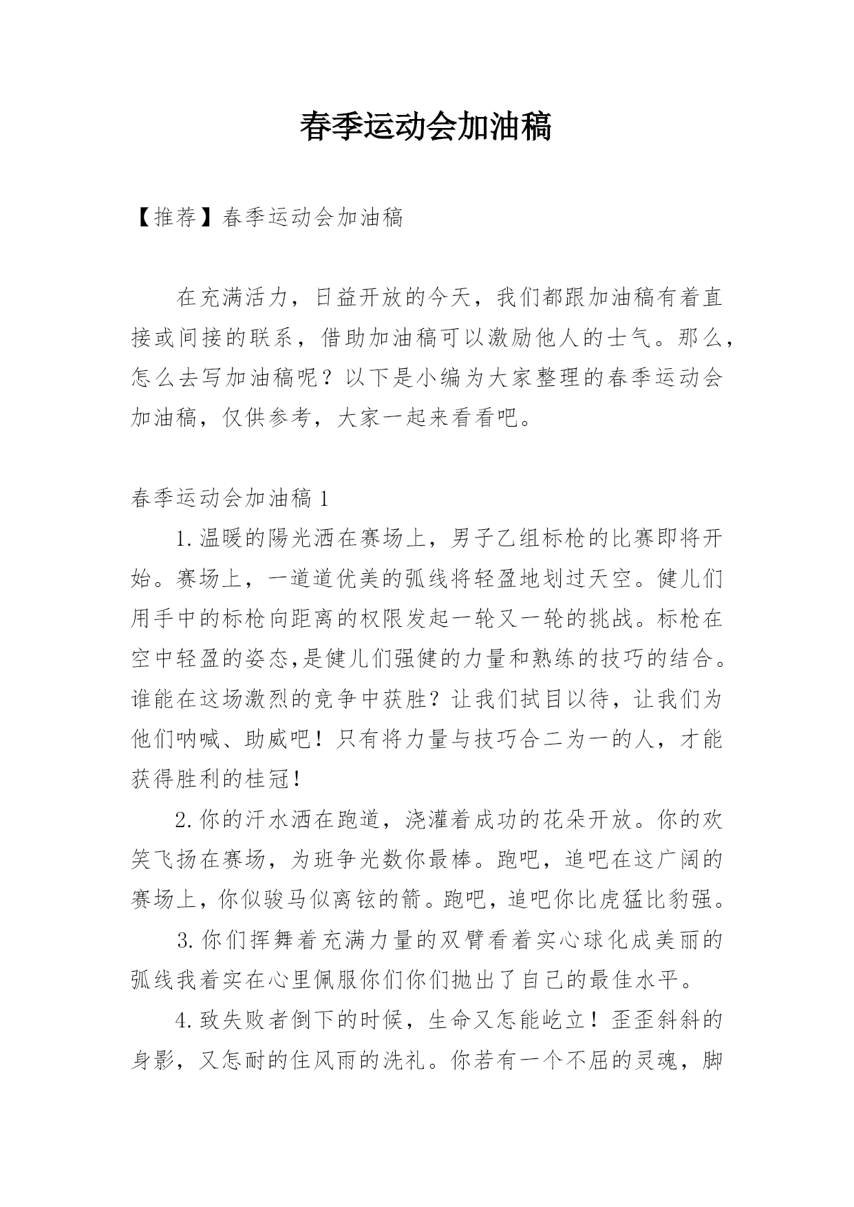 春季运动会加油稿【推荐】春季运动会加油稿在充满活力,日益开放的今天,我们都跟加油稿有着直接或间接的联系,借助加油稿可以激励他人的士气。那么,怎么去写加油稿呢?以下是小编为大家整理的春季运动会加油稿,仅供参考,大家一起来看看吧。春季运动会加油稿11.温暖的陽光洒在赛场上,男子乙组标枪的比赛即将开始。赛场上,一道道优美的弧线将轻盈地划过天空。健儿们用手中的标枪向距离的权限发起一轮又一轮的挑战。标枪在空中轻盈的姿态,是健儿们强健的力量和熟练的技巧的结合。谁能在这场激烈的竞争中获胜?让我们拭目以待,让我们为他们呐