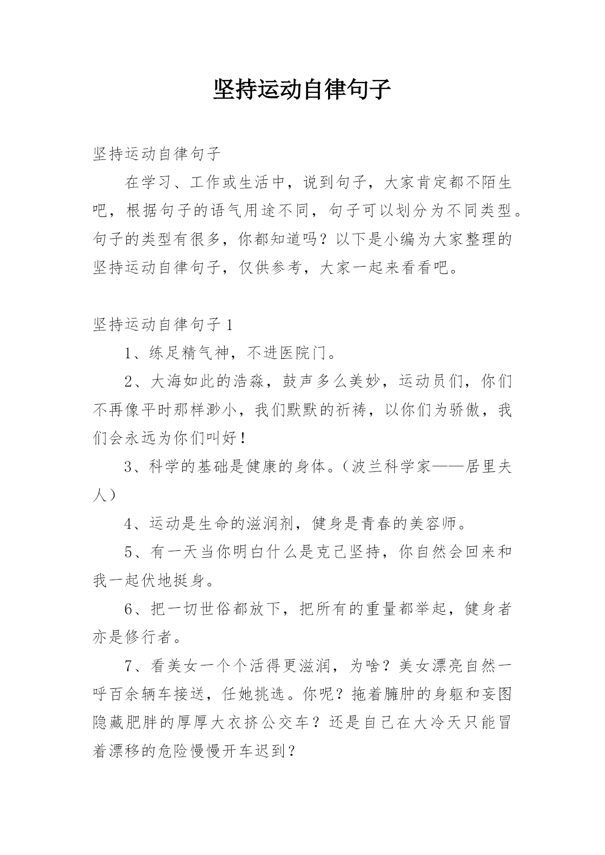 坚持运动自律句子坚持运动自律句子在学习、工作或生活中,说到句子,大家肯定都不陌生吧,根据句子的语气用途不同,句子可以划分为不同类型。句子的类型有很多,你都知道吗?以下是小编为大家整理的坚持运动自律句子,仅供参考,大家一起来看看吧。坚持运动自律句子11、练足精气神,不进医院门。2、大海如此的浩淼,鼓声多么美妙,运动员们,你们不再像平时那样渺小,我们默默的祈祷,以你们为骄傲,我们会永远为你们叫好!3、科学的基础是健康的身体。(波兰科学家——居里夫人)4、运动是生命的滋润剂,健身是青春的美容师。5、有一天当你明