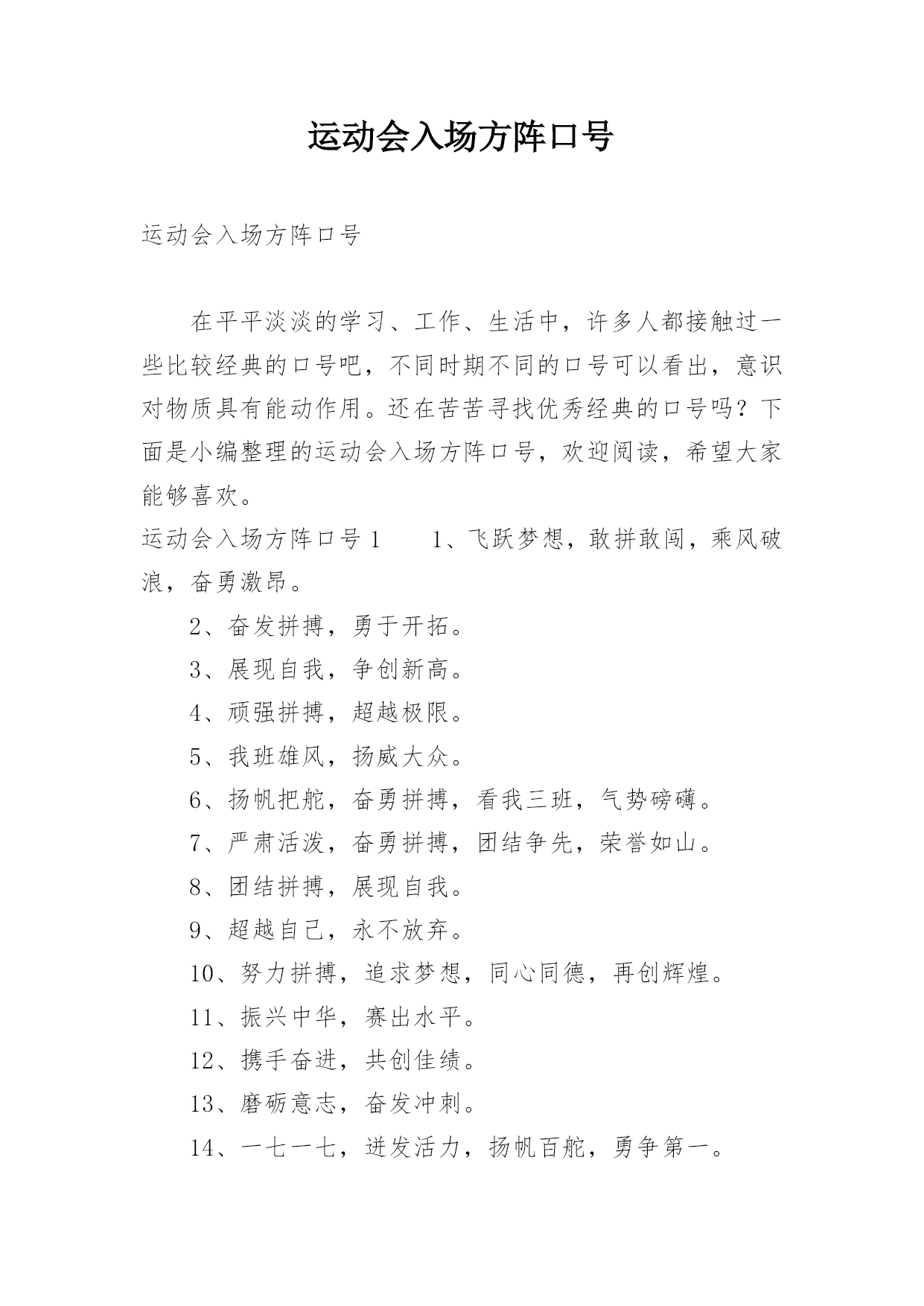 运动会入场方阵口号运动会入场方阵口号在平平淡淡的学习、工作、生活中,许多人都接触过一些比较经典的口号吧,不同时期不同的口号可以看出,意识对物质具有能动作用。还在苦苦寻找优秀经典的口号吗?下面是小编整理的运动会入场方阵口号,欢迎阅读,希望大家能够喜欢。运动会入场方阵口号11、飞跃梦想,敢拼敢闯,乘风破浪,奋勇激昂。2、奋发拼搏,勇于开拓。3、展现自我,争创新高。4、顽强拼搏,超越极限。5、我班雄风,扬威大众。6、扬帆把舵,奋勇拼搏,看我三班,气势磅礴。7、严肃活泼,奋勇拼搏,团结争先,荣誉如山。8、团结拼搏