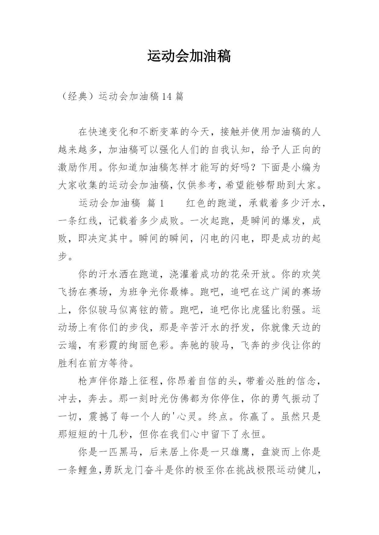 运动会加油稿(经典)运动会加油稿14篇在快速变化和不断变革的今天,接触并使用加油稿的人越来越多,加油稿可以强化人们的自我认知,给予人正向的激励作用。你知道加油稿怎样才能写的好吗?下面是小编为大家收集的运动会加油稿,仅供参考,希望能够帮助到大家。运动会加油稿篇1红色的跑道,承载着多少汗水,一条红线,记载着多少成败。一次起跑,是瞬间的爆发,成败,即决定其中。瞬间的瞬间,闪电的闪电,即是成功的起步。你的汗水洒在跑道,浇灌着成功的花朵开放。你的欢笑飞扬在赛场,为班争光你最棒。跑吧,追吧在这广阔的赛场上,你似骏马似