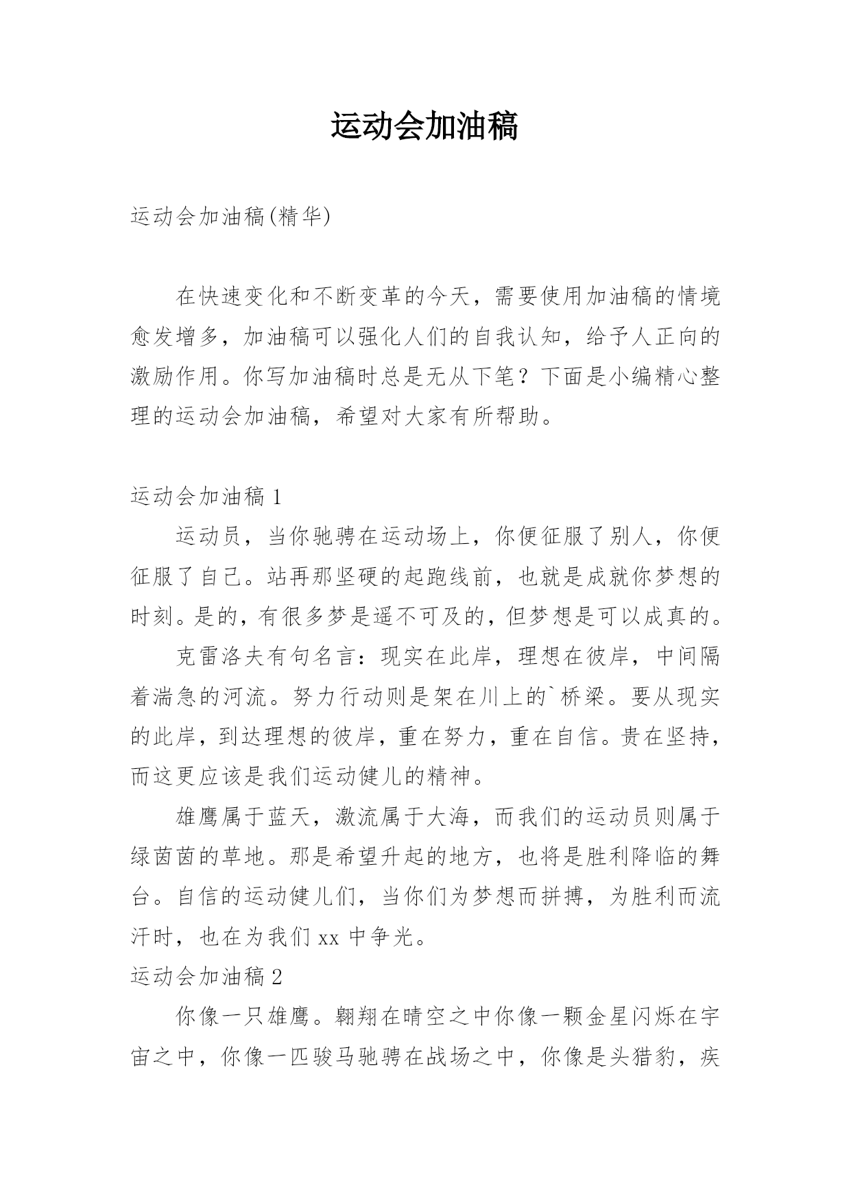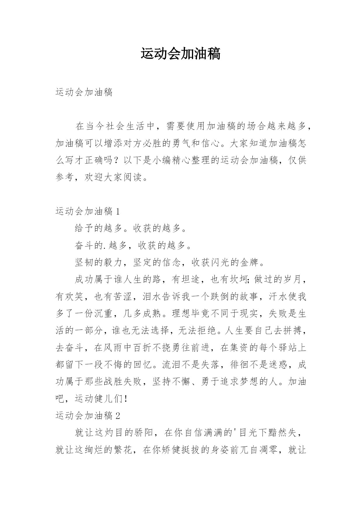 运动会加油稿运动会加油稿在当今社会生活中,需要使用加油稿的场合越来越多,加油稿可以增添对方必胜的勇气和信心。大家知道加油稿怎么写才正确吗?以下是小编精心整理的运动会加油稿,仅供参考,欢迎大家阅读。运动会加油稿1给予的越多。收获的越多。奋斗的.越多,收获的越多。坚韧的毅力,坚定的信念,收获闪光的金牌。成功属于谁人生的路,有坦途,也有坎坷;做过的岁月,有欢笑,也有苦涩,泪水告诉我一个跌倒的故事,汗水使我多了一份沉重,几多成熟。理想毕竟不同于现实,失败是生活的一部分,谁也无法选择,无法拒绝。人生要自己去拼搏,去