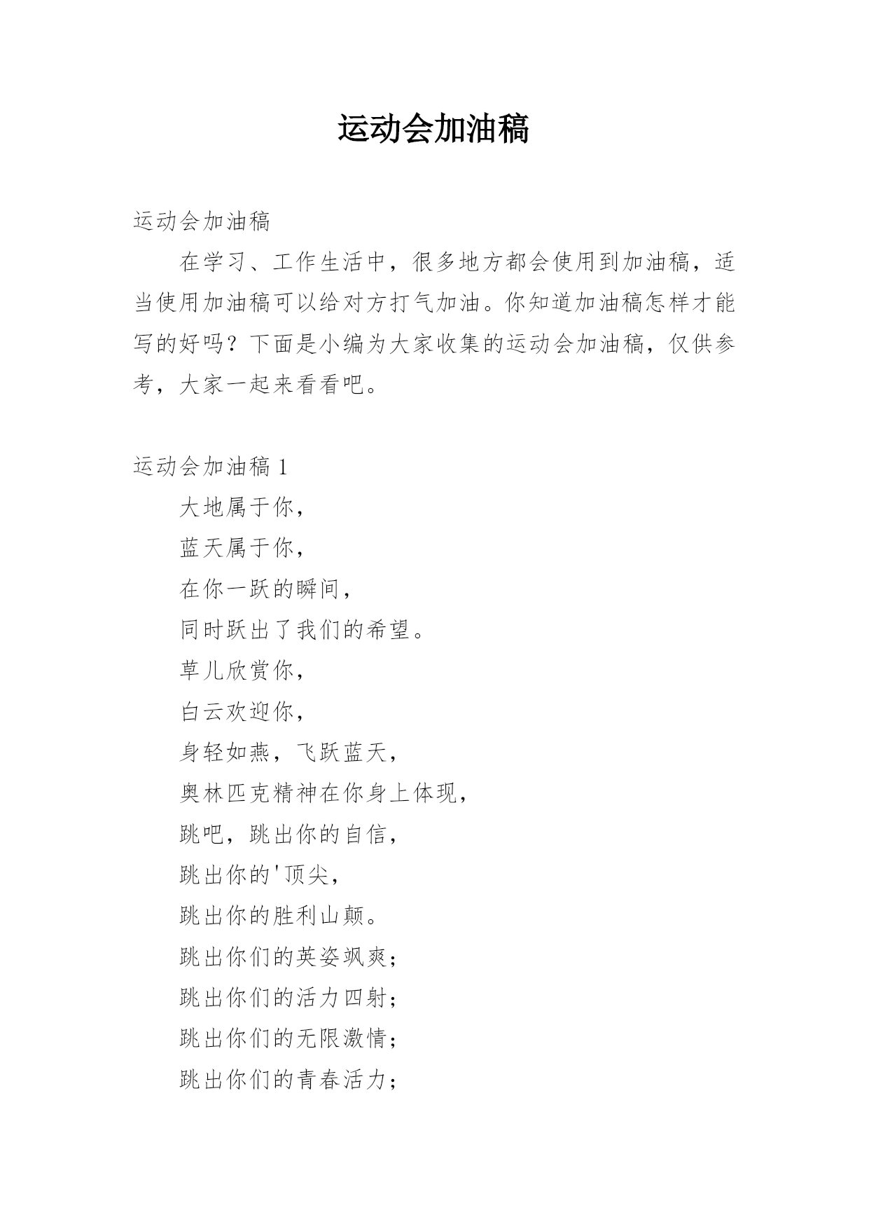 运动会加油稿运动会加油稿在学习、工作生活中,很多地方都会使用到加油稿,适当使用加油稿可以给对方打气加油。你知道加油稿怎样才能写的好吗?下面是小编为大家收集的运动会加油稿,仅供参考,大家一起来看看吧。运动会加油稿1大地属于你,蓝天属于你,在你一跃的瞬间,同时跃出了我们的希望。草儿欣赏你,白云欢迎你,身轻如燕,飞跃蓝天,奥林匹克精神在你身上体现,跳吧,跳出你的自信,跳出你的'顶尖,跳出你的胜利山颠。跳出你们的英姿飒爽;跳出你们的活力四射;跳出你们的无限激情;跳出你们的青春活力;跳出你们的辉煌成就。运动会加油稿