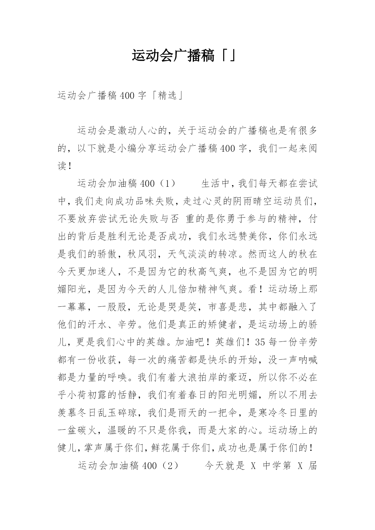 运动会广播稿「」运动会广播稿400字「精选」运动会是激动人心的,关于运动会的广播稿也是有很多的,以下就是小编分享运动会广播稿400字,我们一起来阅读!运动会加油稿400(1)生活中,我们每天都在尝试中,我们走向成功品味失败,走过心灵的阴雨晴空运动员们,不要放弃尝试无论失败与否重的是你勇于参与的精神,付出的背后是胜利无论是否成功,我们永远赞美你,你们永远是我们的骄傲,秋风羽,天气淡淡的转凉。然而这人的秋在今天更加迷人,不是因为它的秋高气爽,也不是因为它的明媚阳光,是因为今天的人儿倍加精神气爽。看!运动场上那