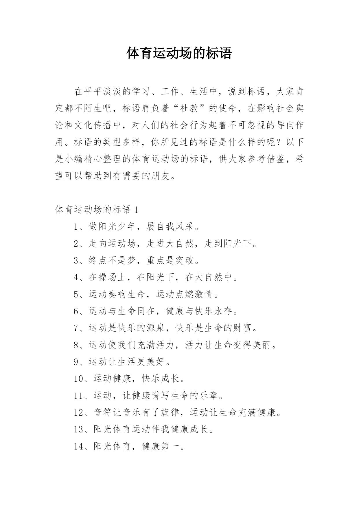 体育运动场的标语在平平淡淡的学习、工作、生活中,说到标语,大家肯定都不陌生吧,标语肩负着“社教”的使命,在影响社会舆论和文化传播中,对人们的社会行为起着不可忽视的导向作用。标语的类型多样,你所见过的标语是什么样的呢?以下是小编精心整理的体育运动场的标语,供大家参考借鉴,希望可以帮助到有需要的朋友。体育运动场的标语11、做阳光少年,展自我风采。2、走向运动场,走进大自然,走到阳光下。3、终点不是梦,重点是突破。4、在操场上,在阳光下,在大自然中。5、运动奏响生命,运动点燃激情。6、运动与生命同在,健康与快乐