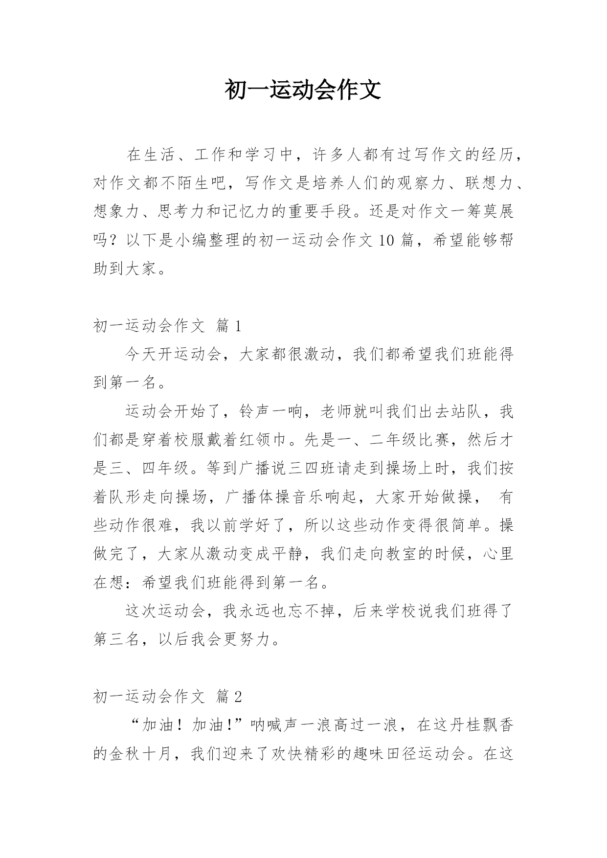初一运动会作文在生活、工作和学习中,许多人都有过写作文的经历,对作文都不陌生吧,写作文是培养人们的观察力、联想力、想象力、思考力和记忆力的重要手段。还是对作文一筹莫展吗?以下是小编整理的初一运动会作文10篇,希望能够帮助到大家。初一运动会作文篇1今天开运动会,大家都很激动,我们都希望我们班能得到第一名。运动会开始了,铃声一响,老师就叫我们出去站队,我们都是穿着校服戴着红领巾。先是一、二年级比赛,然后才是三、四年级。等到广播说三四班请走到操场上时,我们按着队形走向操场,广播体操音乐响起,大家开始做操,有些动