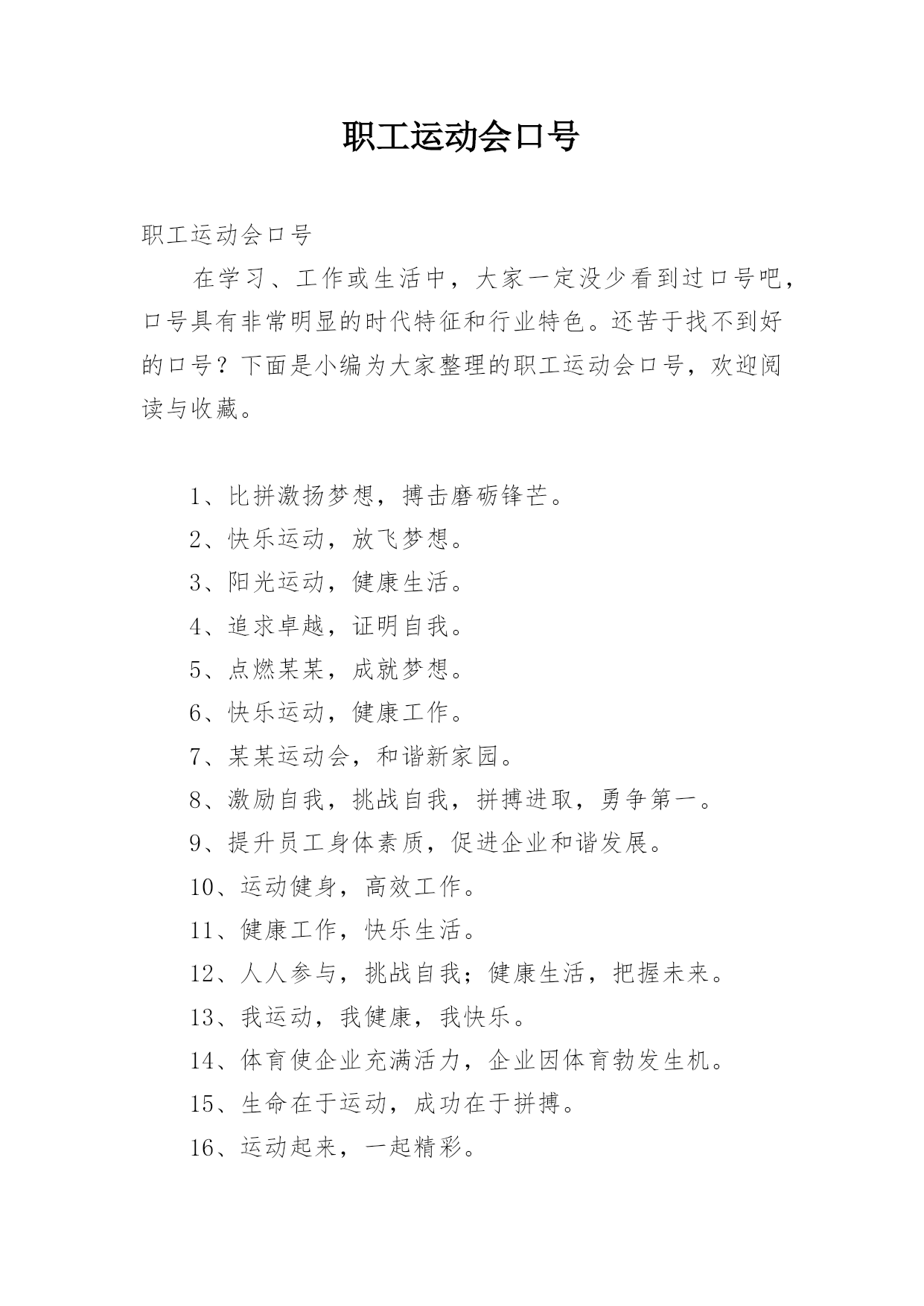 职工运动会口号职工运动会口号在学习、工作或生活中,大家一定没少看到过口号吧,口号具有非常明显的时代特征和行业特色。还苦于找不到好的口号?下面是小编为大家整理的职工运动会口号,欢迎阅读与收藏。1、比拼激扬梦想,搏击磨砺锋芒。2、快乐运动,放飞梦想。3、阳光运动,健康生活。4、追求卓越,证明自我。5、点燃某某,成就梦想。6、快乐运动,健康工作。7、某某运动会,和谐新家园。8、激励自我,挑战自我,拼搏进取,勇争第一。9、提升员工身体素质,促进企业和谐发展。10、运动健身,高效工作。11、健康工作,快乐生活。12