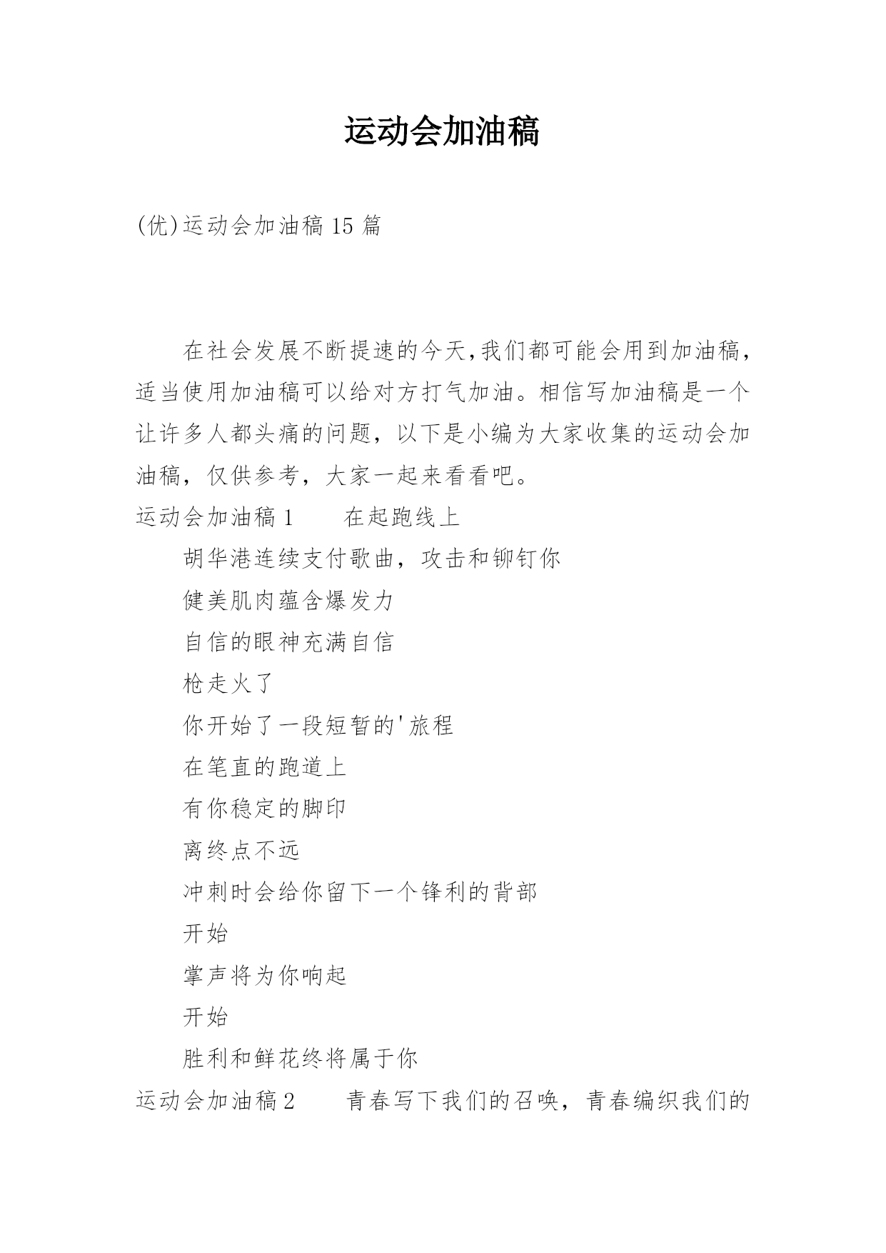 运动会加油稿(优)运动会加油稿15篇在社会发展不断提速的今天,我们都可能会用到加油稿,适当使用加油稿可以给对方打气加油。相信写加油稿是一个让许多人都头痛的问题,以下是小编为大家收集的运动会加油稿,仅供参考,大家一起来看看吧。运动会加油稿1在起跑线上胡华港连续支付歌曲,攻击和铆钉你健美肌肉蕴含爆发力自信的眼神充满自信枪走火了你开始了一段短暂的'旅程在笔直的跑道上有你稳定的脚印离终点不远冲刺时会给你留下一个锋利的背部开始掌声将为你响起开始胜利和鲜花终将属于你运动会加油稿2青春写下我们的召唤,青春编织我们的诺言