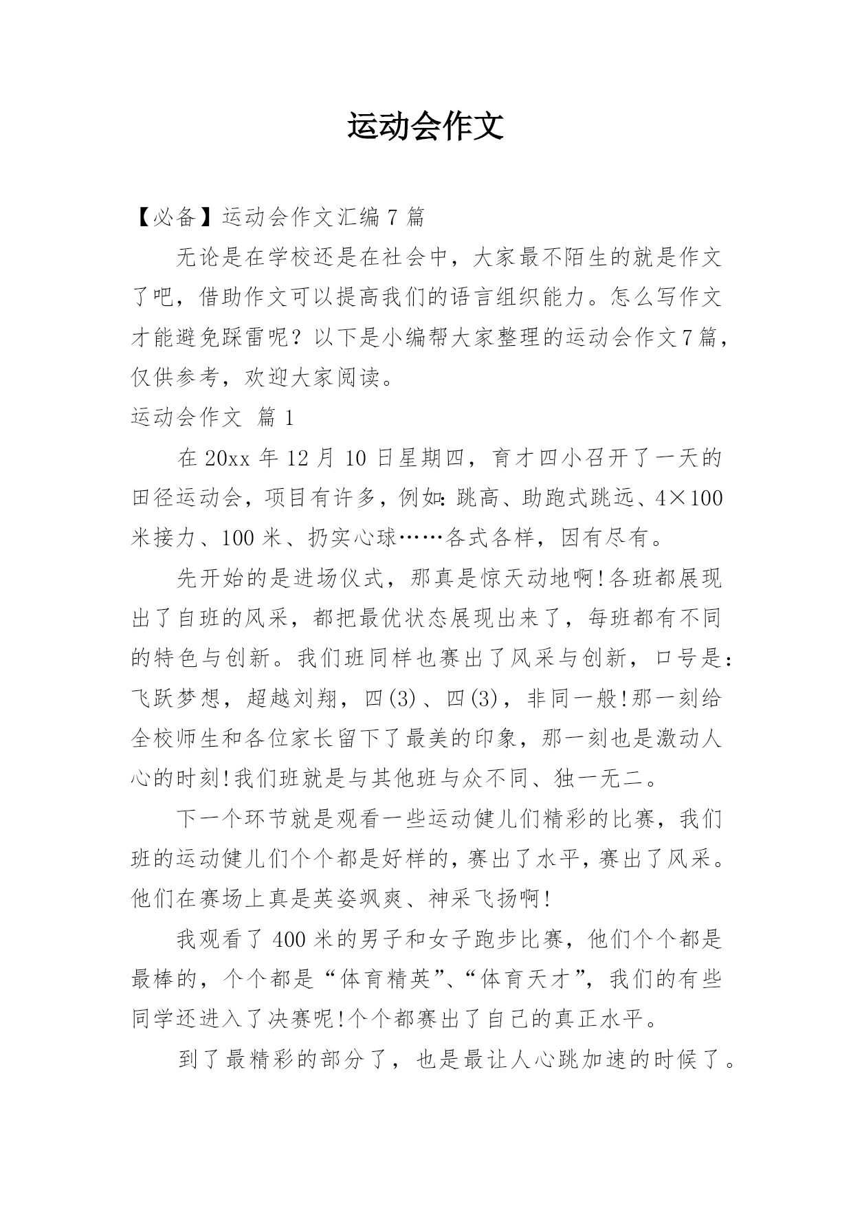 运动会作文【必备】运动会作文汇编7篇无论是在学校还是在社会中,大家最不陌生的就是作文了吧,借助作文可以提高我们的语言组织能力。怎么写作文才能避免踩雷呢?以下是小编帮大家整理的运动会作文7篇,仅供参考,欢迎大家阅读。运动会作文篇1在20xx年12月10日星期四,育才四小召开了一天的田径运动会,项目有许多,例如:跳高、助跑式跳远、4×100米接力、100米、扔实心球……各式各样,因有尽有。先开始的是进场仪式,那真是惊天动地啊!各班都展现出了自班的风采,都把最优状态展现出来了,每班都有不同的特色与创新。我们班同