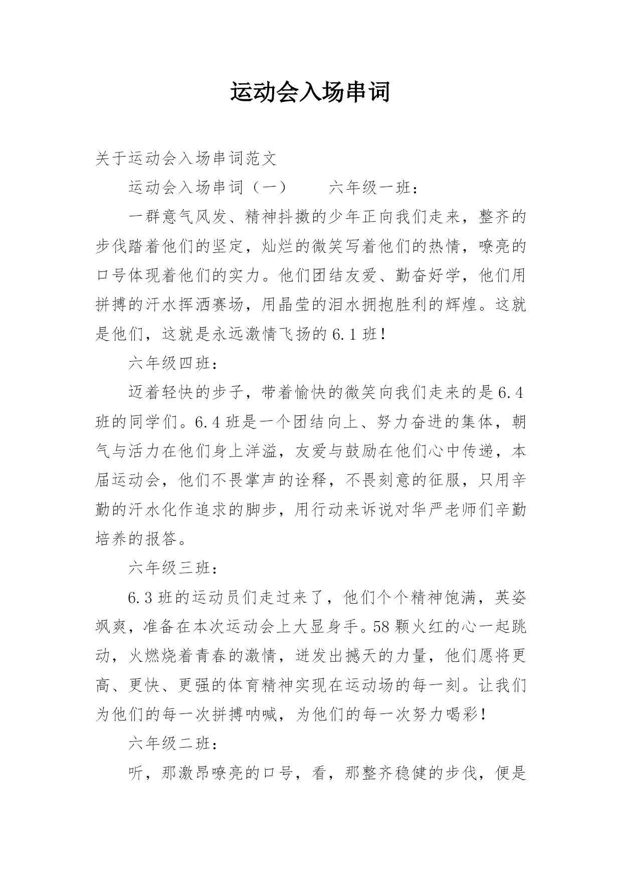 运动会入场串词关于运动会入场串词范文运动会入场串词(一)六年级一班:一群意气风发、精神抖擞的少年正向我们走来,整齐的步伐踏着他们的坚定,灿烂的微笑写着他们的热情,嘹亮的口号体现着他们的实力。他们团结友爱、勤奋好学,他们用拼搏的汗水挥洒赛场,用晶莹的泪水拥抱胜利的辉煌。这就是他们,这就是永远激情飞扬的6.1班!六年级四班:迈着轻快的步子,带着愉快的微笑向我们走来的是6.4班的同学们。6.4班是一个团结向上、努力奋进的集体,朝气与活力在他们身上洋溢,友爱与鼓励在他们心中传递,本届运动会,他们不畏掌声的诠释,不