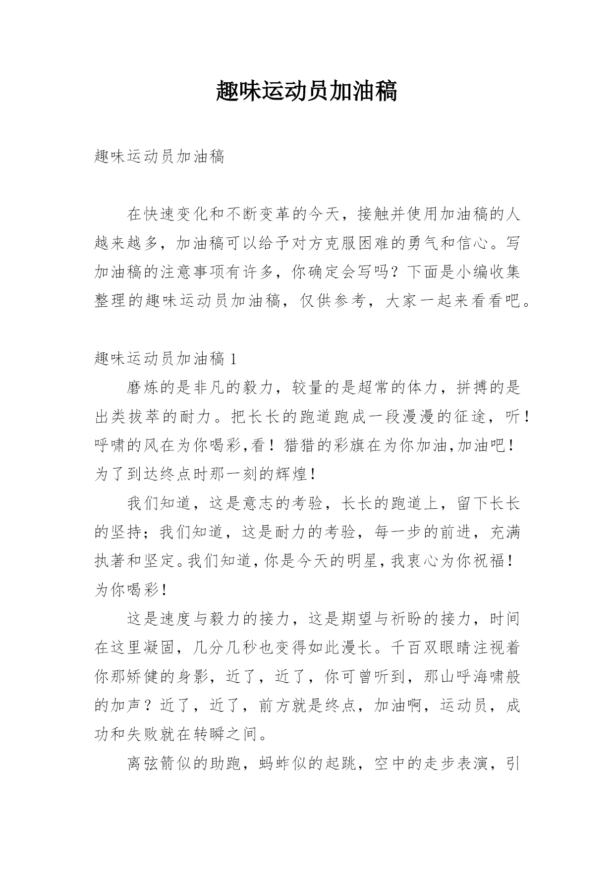 趣味运动员加油稿趣味运动员加油稿在快速变化和不断变革的今天,接触并使用加油稿的人越来越多,加油稿可以给予对方克服困难的勇气和信心。写加油稿的注意事项有许多,你确定会写吗?下面是小编收集整理的趣味运动员加油稿,仅供参考,大家一起来看看吧。趣味运动员加油稿1磨炼的是非凡的毅力,较量的是超常的体力,拼搏的是出类拔萃的耐力。把长长的跑道跑成一段漫漫的征途,听!呼啸的风在为你喝彩,看!猎猎的彩旗在为你加油,加油吧!为了到达终点时那一刻的辉煌!我们知道,这是意志的考验,长长的跑道上,留下长长的坚持;我们知道,这是耐力
