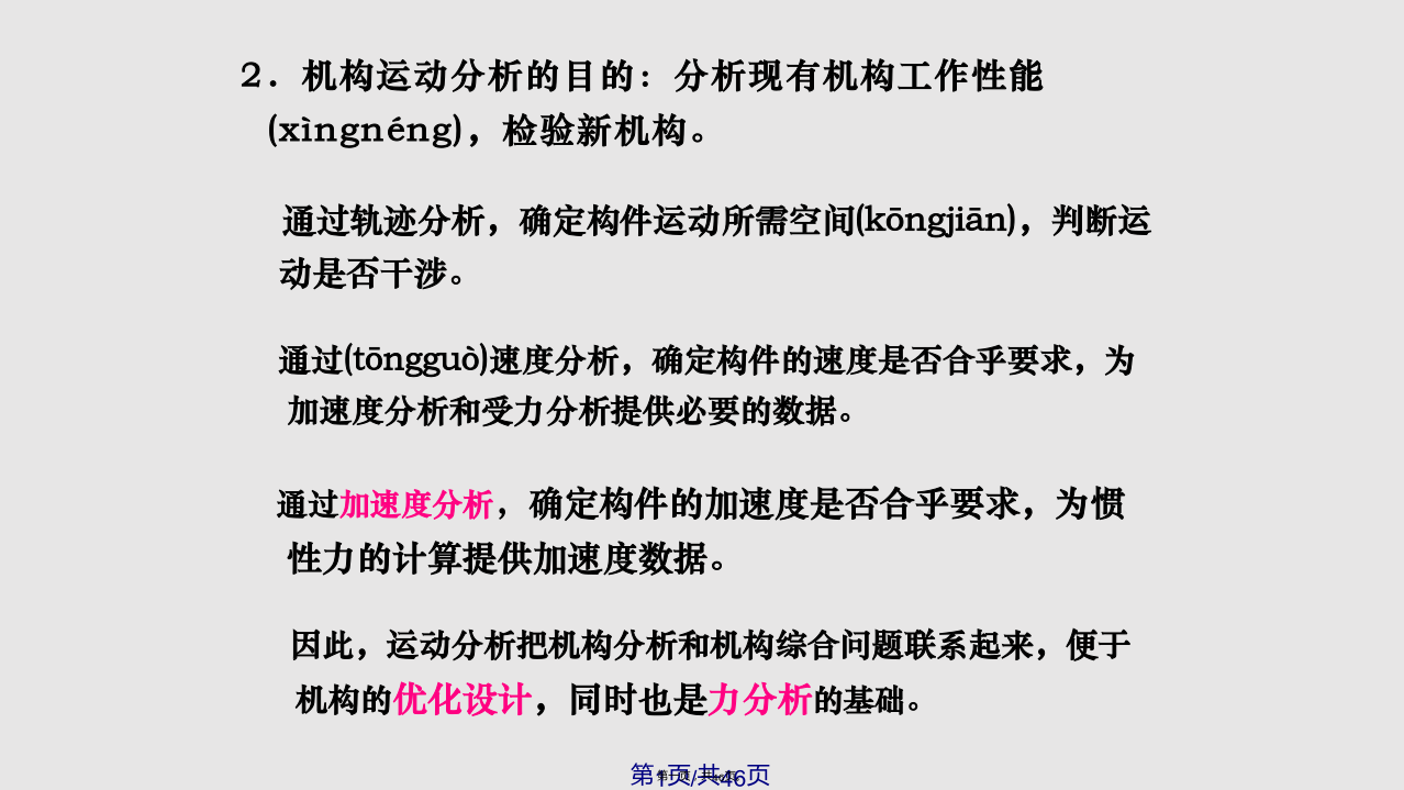 2.机构运动分析的目的:分析现有机构工作性能(xìngnéng),检验新机构。3.机构运动(yùndòng)分析的方法:2.解析法:效率高,速度快,精度高;便于对机构进行深入的研究。(1)复数矢量法(2)矩阵法位置方程:是速度分析和加速度分析的基础(jīchǔ)所用数学工具:矢量、复数、矩阵重点:矢量方程图法和复数矢量法瞬心的种类(zhǒnglèi)速度(sùdù)瞬心的位置(2)三心定理法-------用于不直接(zhíjiē)相连构件。2.用瞬心法作机构的速度(sùdù)分析1.铰链(jiǎoliàn
