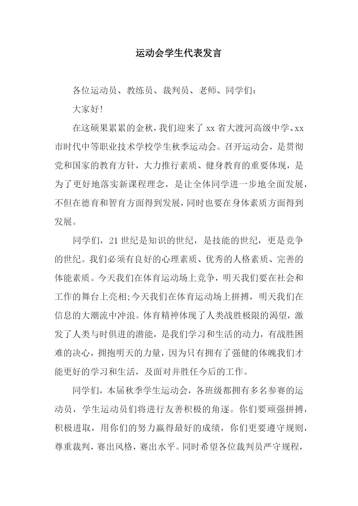 运动会学生代表发言各位运动员、教练员、裁判员、老师、同学们:大家好!在这硕果累累的金秋,我们迎来了xx省大渡河高级中学、xx市时代中等职业技术学校学生秋季运动会。召开运动会,是贯彻党和国家的教育方针,大力推行素质、健身教育的重要体现,是为了更好地落实新课程理念,是让全体同学进一步地全面发展,不但在德育和智育方面得到发展,同时也要在身体素质方面得到发展。同学们,21世纪是知识的世纪,是技能的世纪,更是竞争的世纪。我们必须有良好的心理素质、优秀的人格素质、完善的体能素质。今天我们在体育运动场上竞争,明天我们要