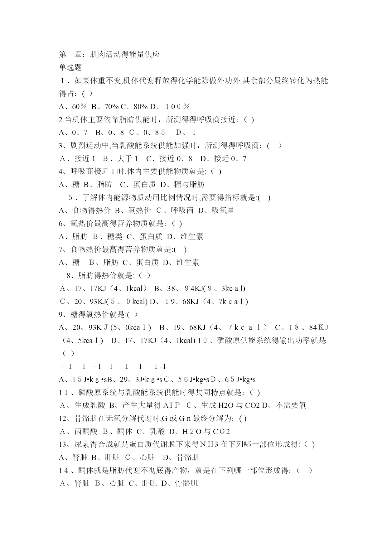 第一章:肌肉活动得能量供应单选题1、如果体重不变,机体代谢释放得化学能除做外功外,其余部分最终转化为热能得占:()A、60%B、70%C、80%D、100%当机体主要依靠脂肪供能时,所测得得呼吸商接近:()A、0、7B、0、8C、0、85D、13、剧烈运动中,当乳酸能系统供能加强时,所测得得呼吸商:()A、接近1B、大于1C、接近0、8D、接近0、74、呼吸商接近1时,体内主要供能物质就是:()A、糖B、脂肪C、蛋白质D、糖与脂肪5、了解体内能源物质动用比例情况时,需要得指标就是:()食物得热价B、氧热价