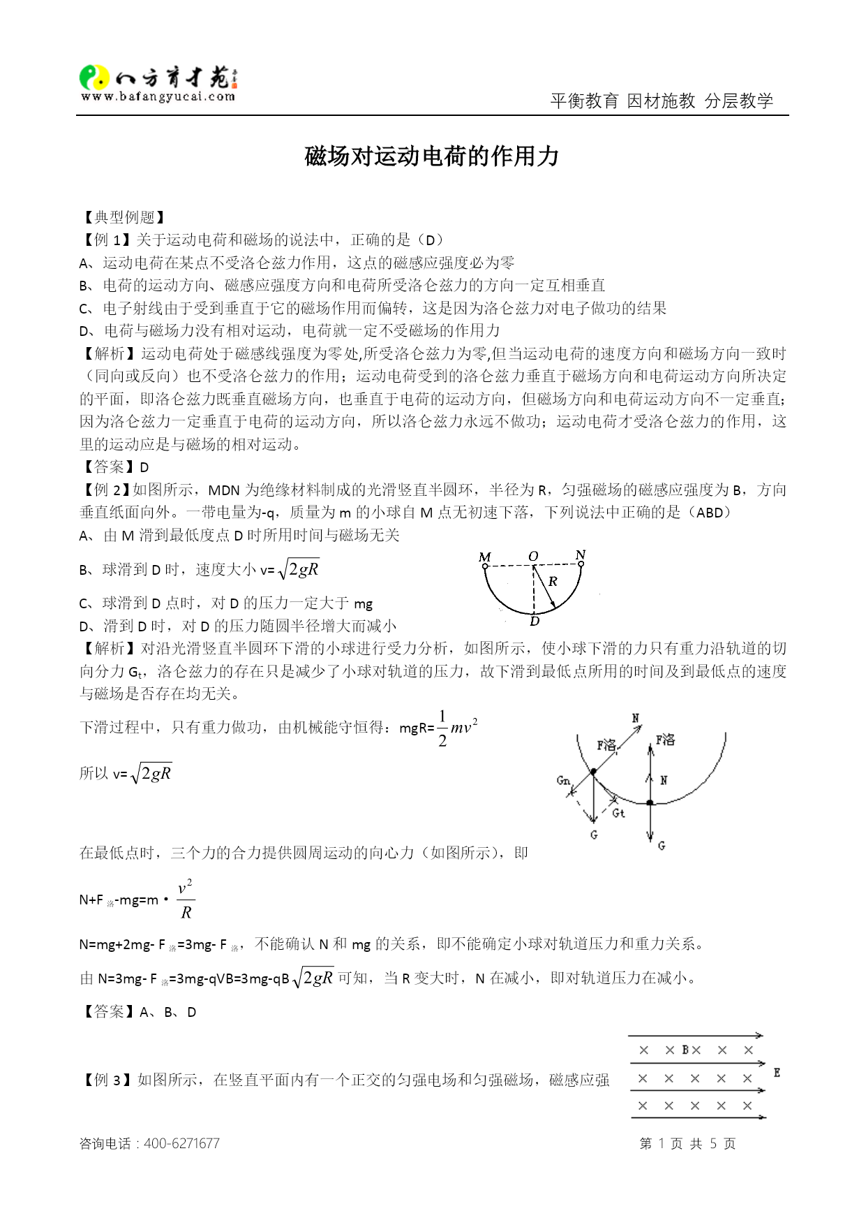 平衡教育因材施教分层教学PAGE咨询电话:400-6271677第PAGE5页共NUMPAGES5页磁场对运动电荷的作用力【典型例题】【例1】关于运动电荷和磁场的说法中,正确的是(D)A、运动电荷在某点不受洛仑兹力作用,这点的磁感应强度必为零B、电荷的运动方向、磁感应强度方向和电荷所受洛仑兹力的方向一定互相垂直C、电子射线由于受到垂直于它的磁场作用而偏转,这是因为洛仑兹力对电子做功的结果D、电荷与磁场力没有相对运动,电荷就一定不受磁场的作用力【解析】运动电荷处于磁感线强度为零处,所受洛仑