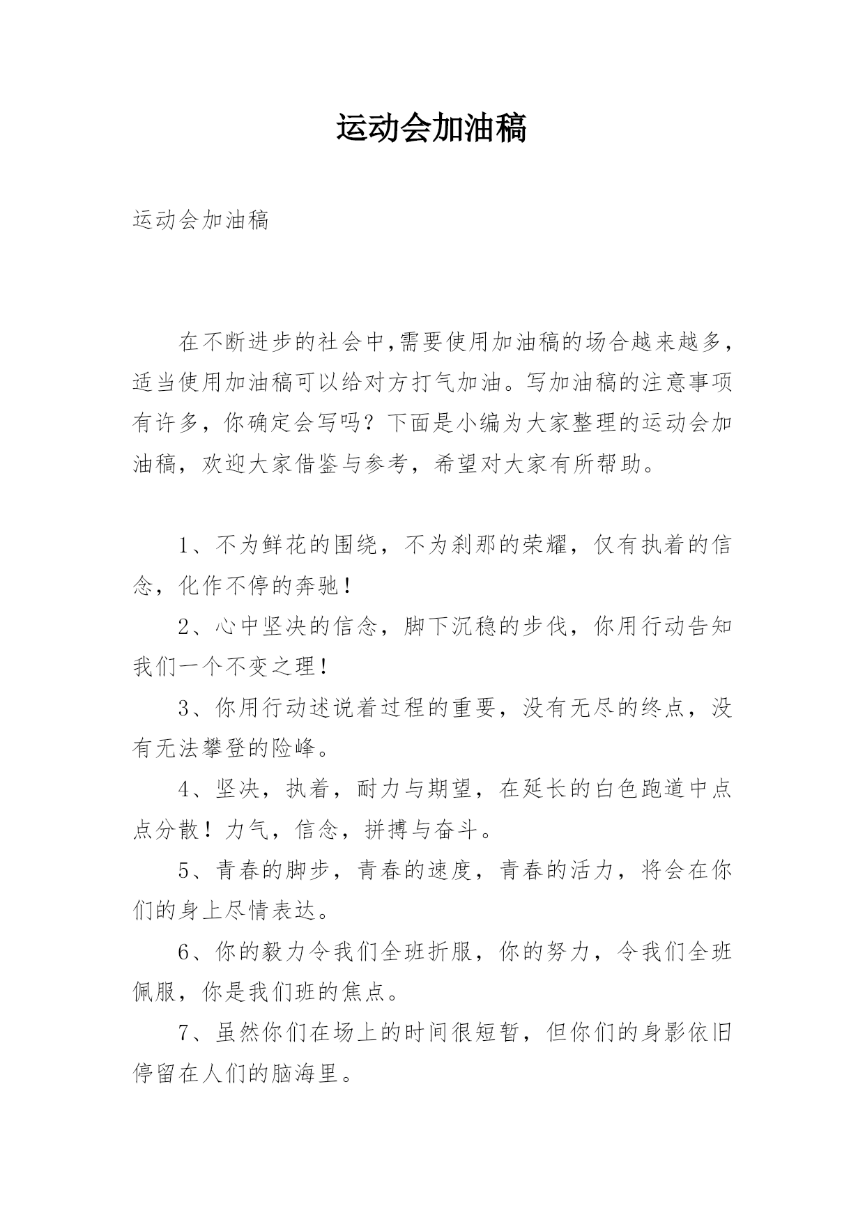 运动会加油稿运动会加油稿在不断进步的社会中,需要使用加油稿的场合越来越多,适当使用加油稿可以给对方打气加油。写加油稿的注意事项有许多,你确定会写吗?下面是小编为大家整理的运动会加油稿,欢迎大家借鉴与参考,希望对大家有所帮助。1、不为鲜花的围绕,不为刹那的荣耀,仅有执着的信念,化作不停的奔驰!2、心中坚决的信念,脚下沉稳的步伐,你用行动告知我们一个不变之理!3、你用行动述说着过程的重要,没有无尽的终点,没有无法攀登的险峰。4、坚决,执着,耐力与期望,在延长的白色跑道中点点分散!力气,信念,拼搏与奋斗。5、青