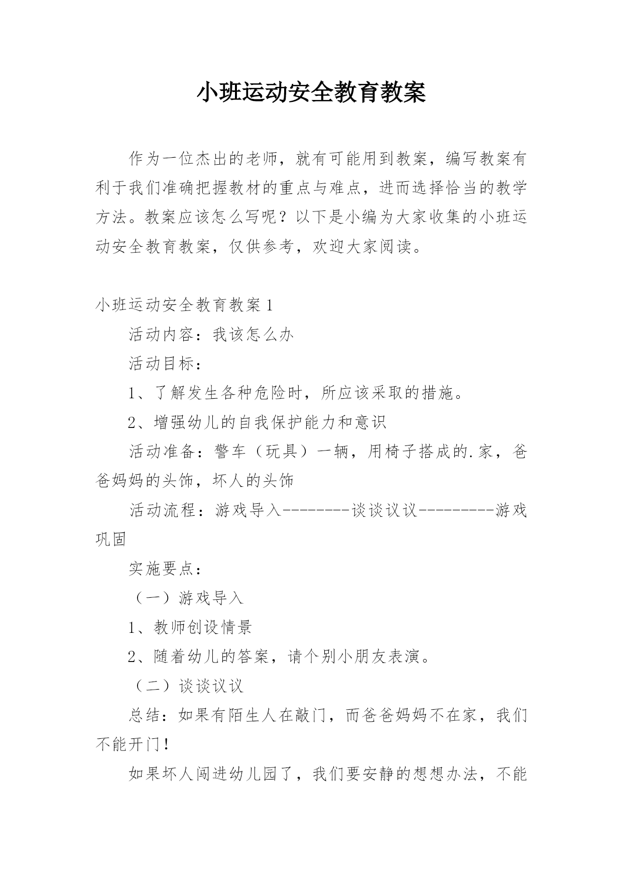 小班运动安全教育教案作为一位杰出的老师,就有可能用到教案,编写教案有利于我们准确把握教材的重点与难点,进而选择恰当的教学方法。教案应该怎么写呢?以下是小编为大家收集的小班运动安全教育教案,仅供参考,欢迎大家阅读。小班运动安全教育教案1活动内容:我该怎么办活动目标:1、了解发生各种危险时,所应该采取的措施。2、增强幼儿的自我保护能力和意识活动准备:警车(玩具)一辆,用椅子搭成的.家,爸爸妈妈的头饰,坏人的头饰活动流程:游戏导入--------谈谈议议---------游戏巩固实施要点:(一)游戏导入1、教师
