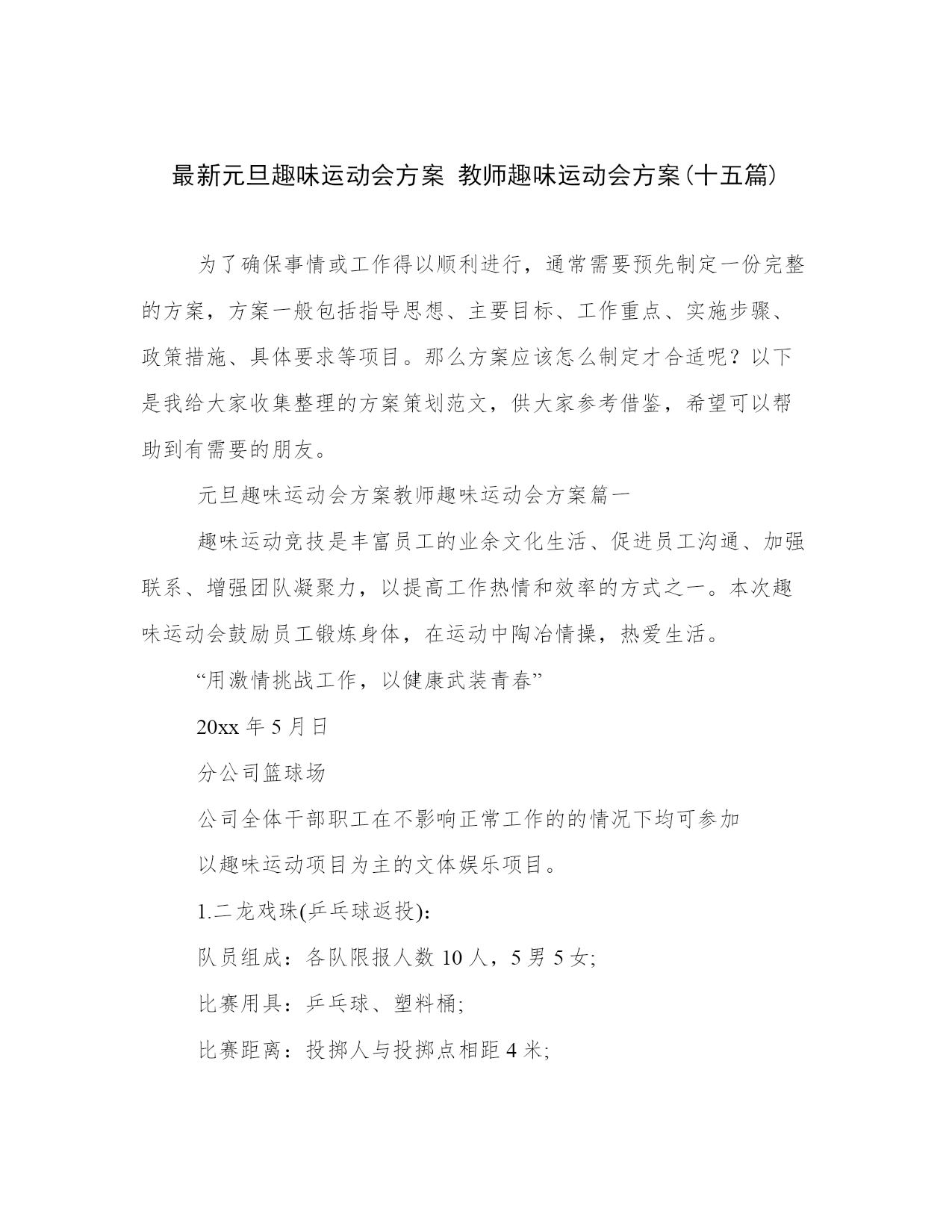 最新元旦趣味运动会方案教师趣味运动会方案(十五篇)为了确保事情或工作得以顺利进行,通常需要预先制定一份完整的方案,方案一般包括指导思想、主要目标、工作重点、实施步骤、政策措施、具体要求等项目。那么方案应该怎么制定才合适呢?以下是我给大家收集整理的方案策划范文,供大家参考借鉴,希望可以帮助到有需要的朋友。元旦趣味运动会方案教师趣味运动会方案篇一趣味运动竞技是丰富员工的业余文化生活、促进员工沟通、加强联系、增强团队凝聚力,以提高工作热情和效率的方式之一。本次趣味运动会鼓励员工锻炼身体,在运动中陶冶情操,热爱生