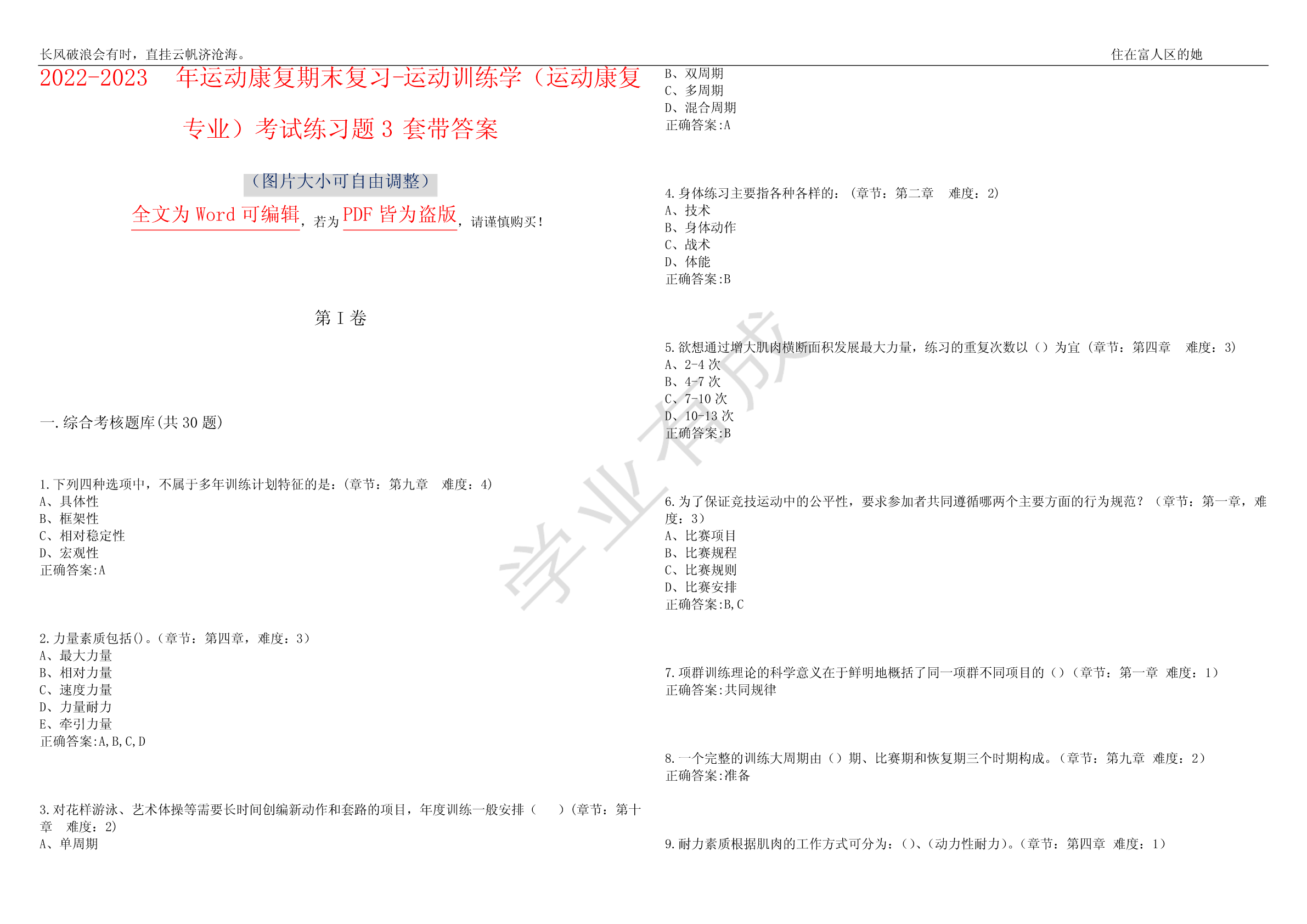 长风破浪会有时,直挂云帆济沧海。住在富人区的她2022-2023年运动康复期末复习-运动训练学(运动康复B、双周期C、多周期D、混合周期专业)考试练习题3套带答案正确答案:A(图片大小可自由调整)4.身体练习主要指各种各样的:(章节:第二章难度:2)全文为Word可编辑PDF皆为盗版A、技术,若为,请谨慎购买!B、身体动作C、战术D、体能正确答案:B第I卷5.欲想通过增大肌肉横断面积发展最大力量,练习的重复次数以()为宜(章节:第四章难度:3)A、2-4次B、4-7次C、7-10次一.综合考核题库(共30