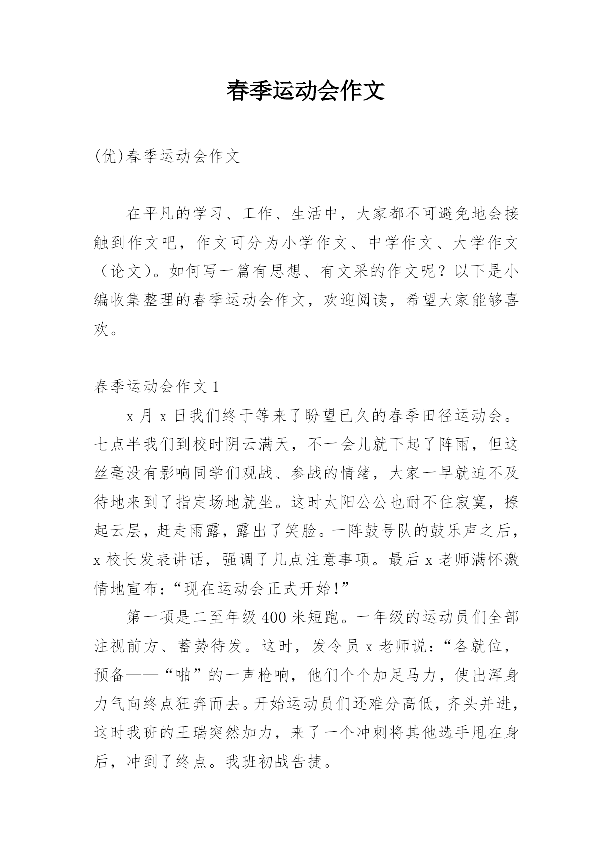 春季运动会作文(优)春季运动会作文在平凡的学习、工作、生活中,大家都不可避免地会接触到作文吧,作文可分为小学作文、中学作文、大学作文(论文)。如何写一篇有思想、有文采的作文呢?以下是小编收集整理的春季运动会作文,欢迎阅读,希望大家能够喜欢。春季运动会作文1x月x日我们终于等来了盼望已久的春季田径运动会。七点半我们到校时阴云满天,不一会儿就下起了阵雨,但这丝毫没有影响同学们观战、参战的情绪,大家一早就迫不及待地来到了指定场地就坐。这时太阳公公也耐不住寂寞,撩起云层,赶走雨露,露出了笑脸。一阵鼓号队的鼓乐声之
