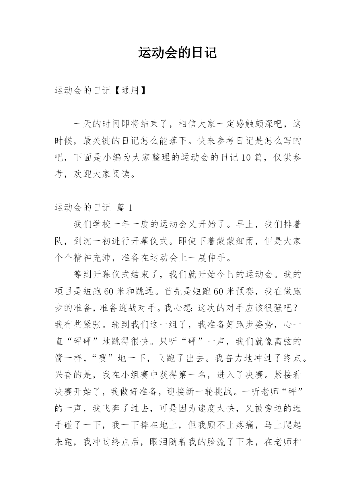 运动会的日记运动会的日记【通用】一天的时间即将结束了,相信大家一定感触颇深吧,这时候,最关键的日记怎么能落下。快来参考日记是怎么写的吧,下面是小编为大家整理的运动会的日记10篇,仅供参考,欢迎大家阅读。运动会的日记篇1我们学校一年一度的运动会又开始了。早上,我们排着队,到沈一初进行开幕仪式。即使下着蒙蒙细雨,但是大家个个精神充沛,准备在运动会上一展伸手。等到开幕仪式结束了,我们就开始今日的运动会。我的项目是短跑60米和跳远。首先是短跑60米预赛,我在做跑步的准备,准备迎战对手。我心想:这次的对手应该很强吧