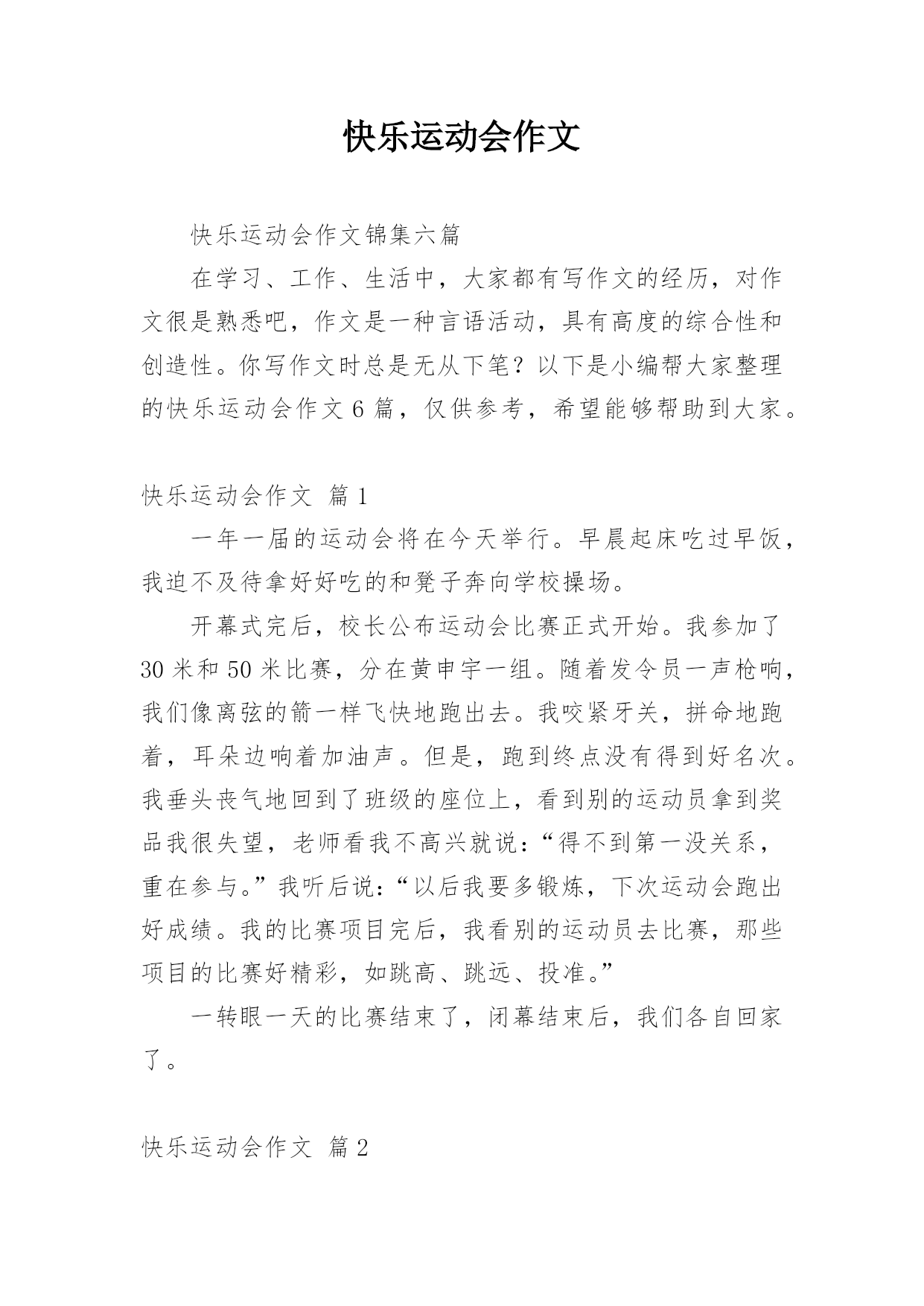 快乐运动会作文关于快乐运动会作文合集6篇无论在学习、工作或是生活中,大家或多或少都会接触过作文吧,根据写作命题的特点,作文可以分为命题作文和非命题作文。你知道作文怎样才能写的好吗?下面是小编为大家收集的快乐运动会作文6篇,希望能够帮助到大家。快乐运动会作文篇1十一月二十五日星期六,是我们学校的运动会。一大早艳阳高照,校门外车子川流不息,人潮涌挤,并且摊贩林立,卖着各种好吃的东西,有糖壶芦、棉花糖、热狗、饮料…等了。校门口,有一道大大的充气拱门,上面写苗苗小学第二十五年校庆。哇!原来学校二十五岁了,比我还大