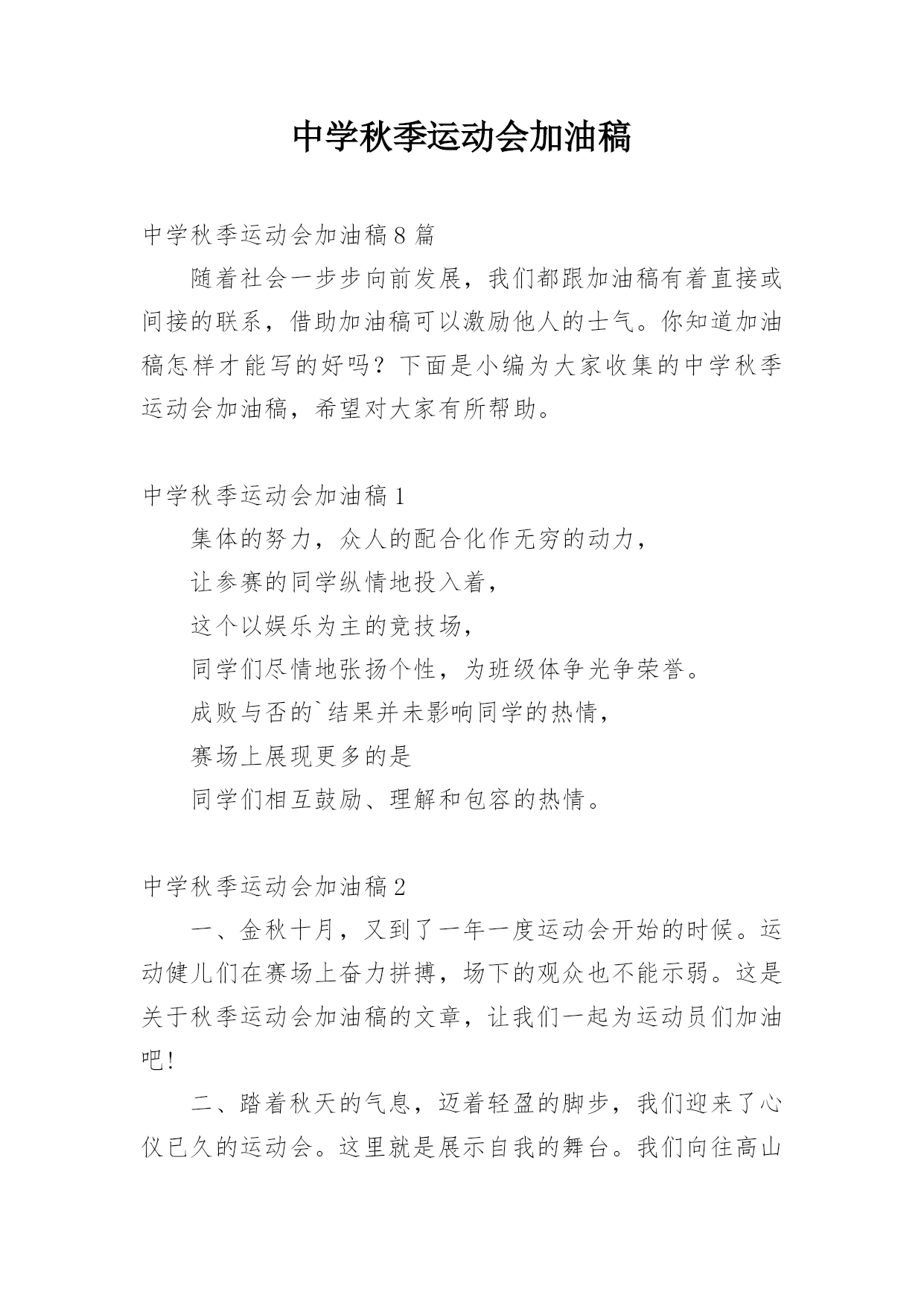 中学秋季运动会加油稿中学秋季运动会加油稿8篇随着社会一步步向前发展,我们都跟加油稿有着直接或间接的联系,借助加油稿可以激励他人的士气。你知道加油稿怎样才能写的好吗?下面是小编为大家收集的中学秋季运动会加油稿,希望对大家有所帮助。中学秋季运动会加油稿1集体的努力,众人的配合化作无穷的动力,让参赛的同学纵情地投入着,这个以娱乐为主的竞技场,同学们尽情地张扬个性,为班级体争光争荣誉。成败与否的`结果并未影响同学的热情,赛场上展现更多的是同学们相互鼓励、理解和包容的热情。中学秋季运动会加油稿2一、金秋十月,又到了