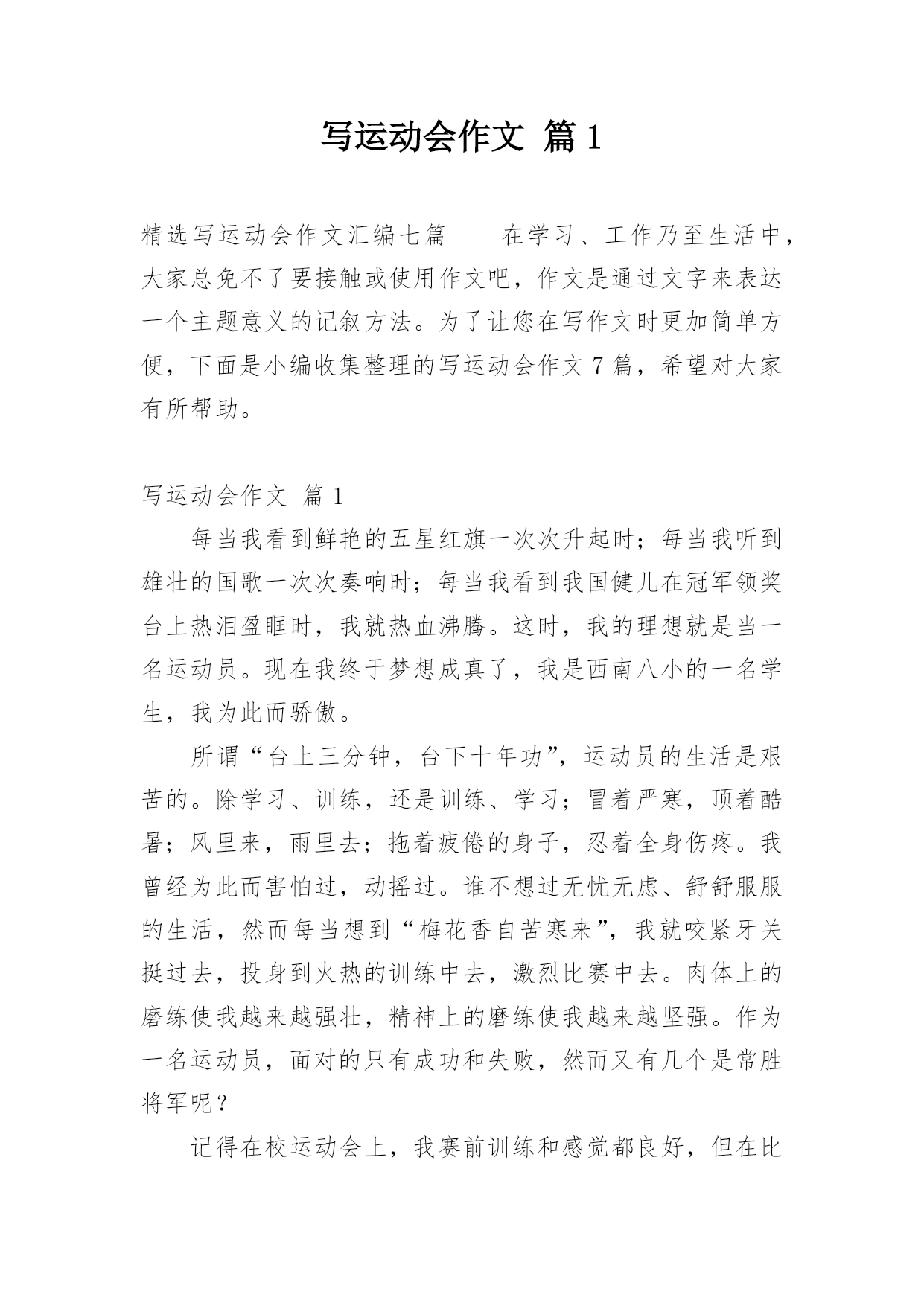 写运动会作文篇1精选写运动会作文汇编七篇在学习、工作乃至生活中,大家总免不了要接触或使用作文吧,作文是通过文字来表达一个主题意义的记叙方法。为了让您在写作文时更加简单方便,下面是小编收集整理的写运动会作文7篇,希望对大家有所帮助。写运动会作文篇1每当我看到鲜艳的五星红旗一次次升起时;每当我听到雄壮的国歌一次次奏响时;每当我看到我国健儿在冠军领奖台上热泪盈眶时,我就热血沸腾。这时,我的理想就是当一名运动员。现在我终于梦想成真了,我是西南八小的一名学生,我为此而骄傲。所谓“台上三分钟,台下十年功”,运动员的生