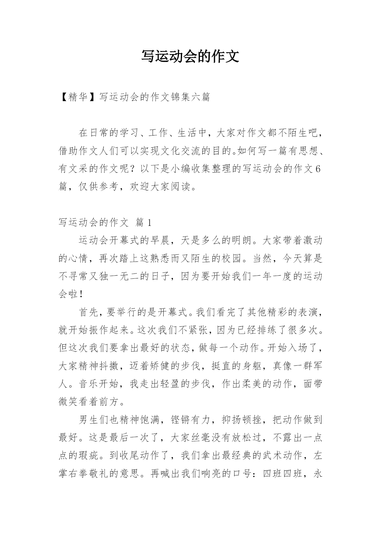 写运动会的作文【精华】写运动会的作文锦集六篇在日常的学习、工作、生活中,大家对作文都不陌生吧,借助作文人们可以实现文化交流的目的。如何写一篇有思想、有文采的作文呢?以下是小编收集整理的写运动会的作文6篇,仅供参考,欢迎大家阅读。写运动会的作文篇1运动会开幕式的早晨,天是多么的明朗。大家带着激动的心情,再次踏上这熟悉而又陌生的校园。当然,今天算是不寻常又独一无二的日子,因为要开始我们一年一度的运动会啦!首先,要举行的是开幕式。我们看完了其他精彩的表演,就开始振作起来。这次我们不紧张,因为已经排练了很多次。但