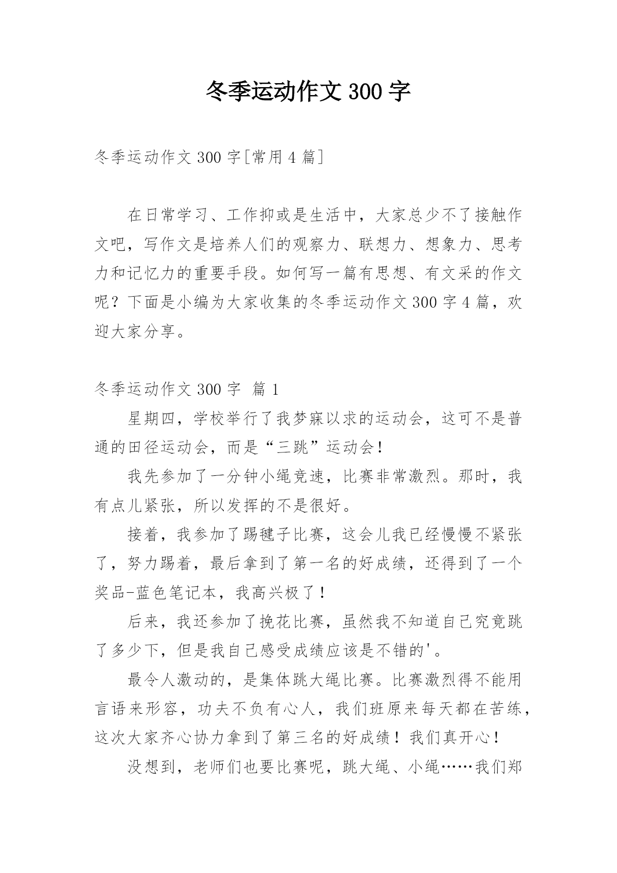冬季运动作文300字冬季运动作文300字[常用4篇]在日常学习、工作抑或是生活中,大家总少不了接触作文吧,写作文是培养人们的观察力、联想力、想象力、思考力和记忆力的重要手段。如何写一篇有思想、有文采的作文呢?下面是小编为大家收集的冬季运动作文300字4篇,欢迎大家分享。冬季运动作文300字篇1星期四,学校举行了我梦寐以求的运动会,这可不是普通的田径运动会,而是“三跳”运动会!我先参加了一分钟小绳竞速,比赛非常激烈。那时,我有点儿紧张,所以发挥的不是很好。接着,我参加了踢毽子比赛,这会儿我已经慢慢不紧张了,