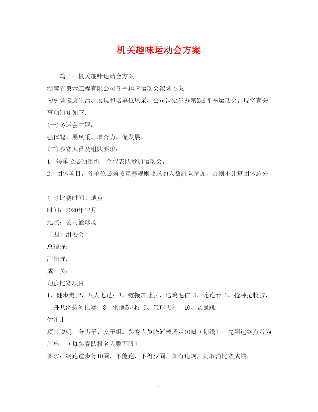 此资料由网络收集而来,如有侵权请告知上传者立即删除。资料共分享,我们负责传递知识。PAGEPAGE11机关趣味运动会方案篇一:机关趣味运动会方案湖南省第六工程有限公司冬季趣味运动会策划方案为引领健康生活、展现和谐单位风采,公司决定举办第X届冬季运动会。现将有关事项通知如下:(一)冬运会主题:强体魄、展风采、增合力、促发展。(二)参赛人员及组队要求:1、每单位必须组织一个代表队参加运动会。2、团体项目,各单位必须按竞赛规则要求的人数组队参加,否则不计算团体总分。(三)比赛时间、地点时间:2020