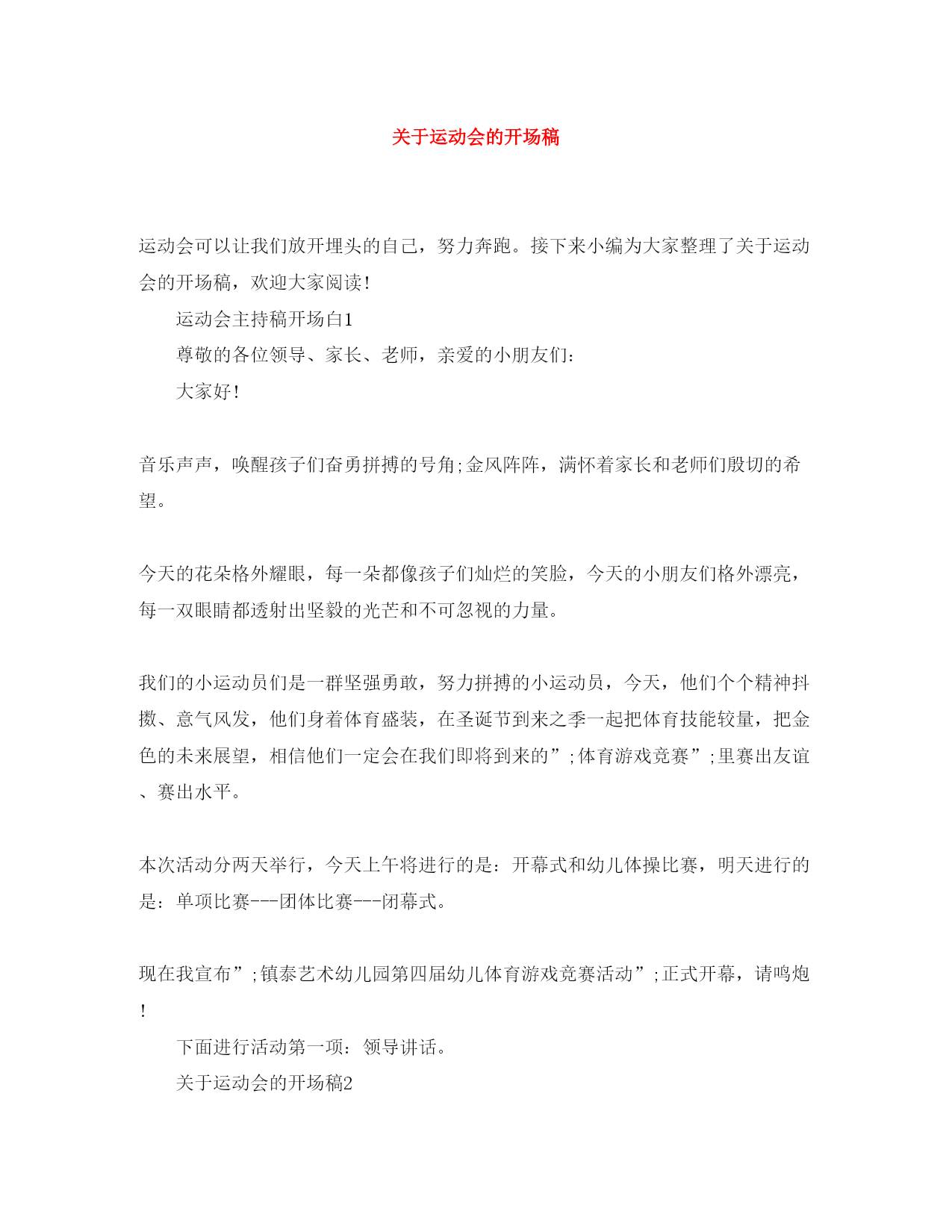 此资料由网络收集而来,如有侵权请告知上传者立即删除。资料共分享,我们负责传递知识。关于运动会的开场稿运动会可以让我们放开埋头的自己,努力奔跑。接下来小编为大家整理了关于运动会的开场稿,欢迎大家阅读!运动会主持稿开场白1尊敬的各位领导、家长、老师,亲爱的小朋友们:大家好!音乐声声,唤醒孩子们奋勇拼搏的号角;金风阵阵,满怀着家长和老师们殷切的希望。今天的花朵格外耀眼,每一朵都像孩子们灿烂的笑脸,今天的小朋友们格外漂亮,每一双眼睛都透射出坚毅的光芒和不可忽视的力量。我们的小运动员们是一群坚强勇敢,努力拼搏的小运