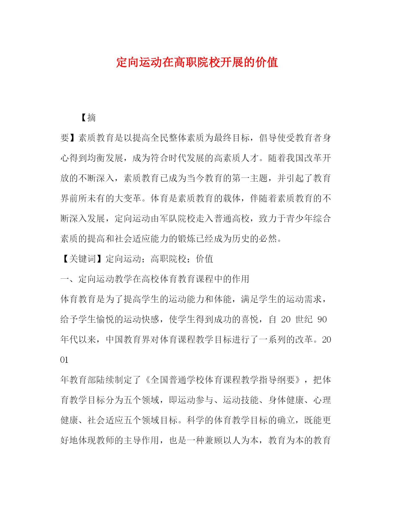 PAGE此资料由网络收集而来,如有侵权请告知上传者立即删除。资料共分享,我们负责传递知识。定向运动在高职院校开展的价值【摘要】素质教育是以提高全民整体素质为最终目标,倡导使受教育者身心得到均衡发展,成为符合时代发展的高素质人才。随着我国改革开放的不断深入,素质教育已成为当今教育的第一主题,并引起了教育界前所未有的大变革。体育是素质教育的载体,伴随着素质教育的不断深入发展,定向运动由军队院校走入普通高校,致力于青少年综合素质的提高和社会适应能力的锻炼已经成为历史的必然。【关键词】定向运动;高职院校;价