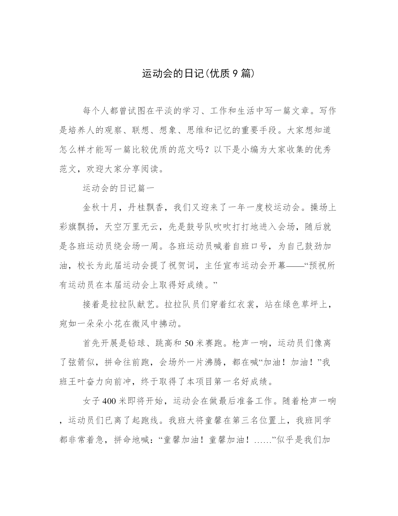 运动会的日记(优质9篇)每个人都曾试图在平淡的学习、工作和生活中写一篇文章。写作是培养人的观察、联想、想象、思维和记忆的重要手段。大家想知道怎么样才能写一篇比较优质的范文吗?以下是小编为大家收集的优秀范文,欢迎大家分享阅读。运动会的日记篇一金秋十月,丹桂飘香,我们又迎来了一年一度校运动会。操场上彩旗飘扬,天空万里无云,先是鼓号队吹吹打打地进入会场,随后就是各班运动员绕会场一周。各班运动员喊着自班口号,为自己鼓劲加油,校长为此届运动会提了祝贺词,主任宣布运动会开幕——“预祝所有运动员在本届运动会上取得好成绩