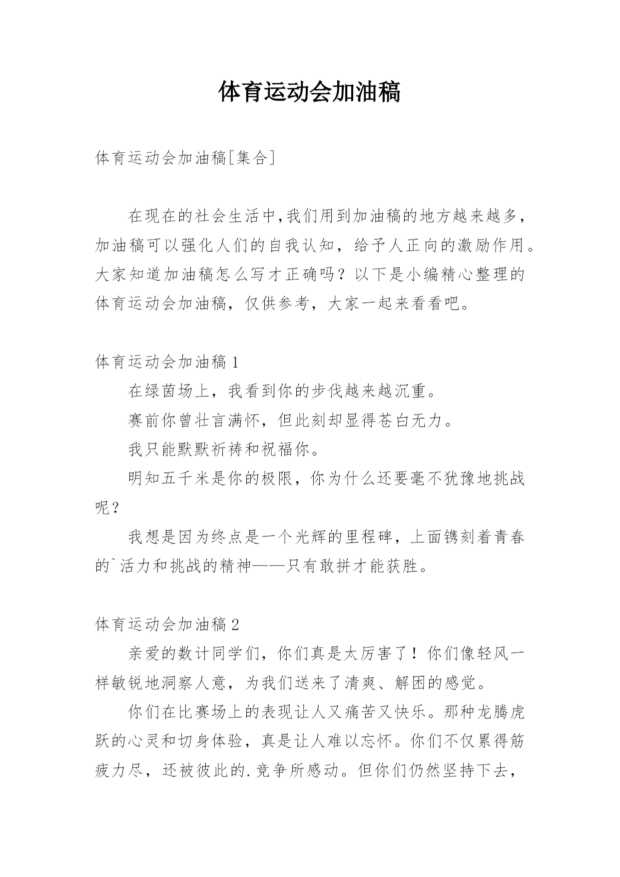 体育运动会加油稿体育运动会加油稿[集合]在现在的社会生活中,我们用到加油稿的地方越来越多,加油稿可以强化人们的自我认知,给予人正向的激励作用。大家知道加油稿怎么写才正确吗?以下是小编精心整理的体育运动会加油稿,仅供参考,大家一起来看看吧。体育运动会加油稿1在绿茵场上,我看到你的步伐越来越沉重。赛前你曾壮言满怀,但此刻却显得苍白无力。我只能默默祈祷和祝福你。明知五千米是你的极限,你为什么还要毫不犹豫地挑战呢?我想是因为终点是一个光辉的里程碑,上面镌刻着青春的`活力和挑战的精神——只有敢拼才能获胜。体育运动会