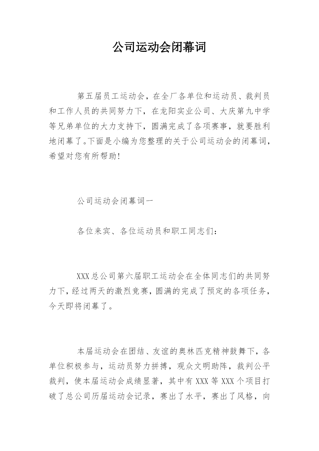 公司运动会闭幕词第五届员工运动会,在全厂各单位和运动员、裁判员和工作人员的共同努力下,在龙阳实业公司、大庆第九中学等兄弟单位的大力支持下,圆满完成了各项赛事,就要胜利地闭幕了。下面是小编为您整理的关于公司运动会的闭幕词,希望对您有所帮助!公司运动会闭幕词一各位来宾、各位运动员和职工同志们:XXX总公司第六届职工运动会在全体同志们的共同努力下,经过两天的激烈竞赛,圆满的完成了预定的各项任务,今天即将闭幕了。本届运动会在团结、友谊的奥林匹克精神鼓舞下,各单位积极参与,运动员努力拼搏,观众文明助阵,裁判公平裁判