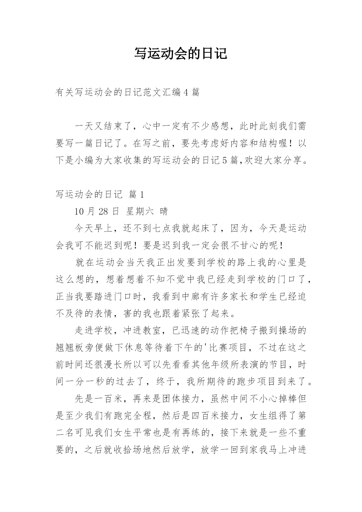 写运动会的日记有关写运动会的日记范文汇编4篇一天又结束了,心中一定有不少感想,此时此刻我们需要写一篇日记了。在写之前,要先考虑好内容和结构喔!以下是小编为大家收集的写运动会的日记5篇,欢迎大家分享。写运动会的日记篇110月28日星期六晴今天早上,还不到七点我就起床了,因为,今天是运动会我可不能迟到呢!要是迟到我一定会很不甘心的呢!就在运动会当天我正出发要到学校的路上我的心里是这么想的,想着想着不知不觉中我已经走到学校的门口了,正当我要踏进门口时,我看到中廊有许多家长和学生已经迫不及待的表情,害的我也跟着紧