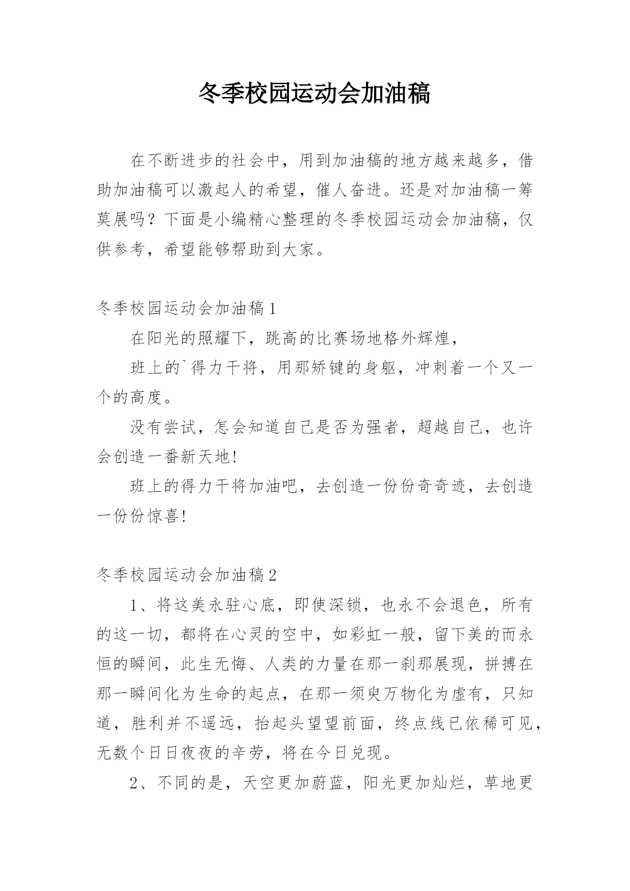 冬季校园运动会加油稿在不断进步的社会中,用到加油稿的地方越来越多,借助加油稿可以激起人的希望,催人奋进。还是对加油稿一筹莫展吗?下面是小编精心整理的冬季校园运动会加油稿,仅供参考,希望能够帮助到大家。冬季校园运动会加油稿1在阳光的照耀下,跳高的比赛场地格外辉煌,班上的`得力干将,用那矫键的身躯,冲刺着一个又一个的高度。没有尝试,怎会知道自己是否为强者,超越自己,也许会创造一番新天地!班上的得力干将加油吧,去创造一份份奇奇迹,去创造一份份惊喜!冬季校园运动会加油稿21、将这美永驻心底,即使深锁,也永不会退色