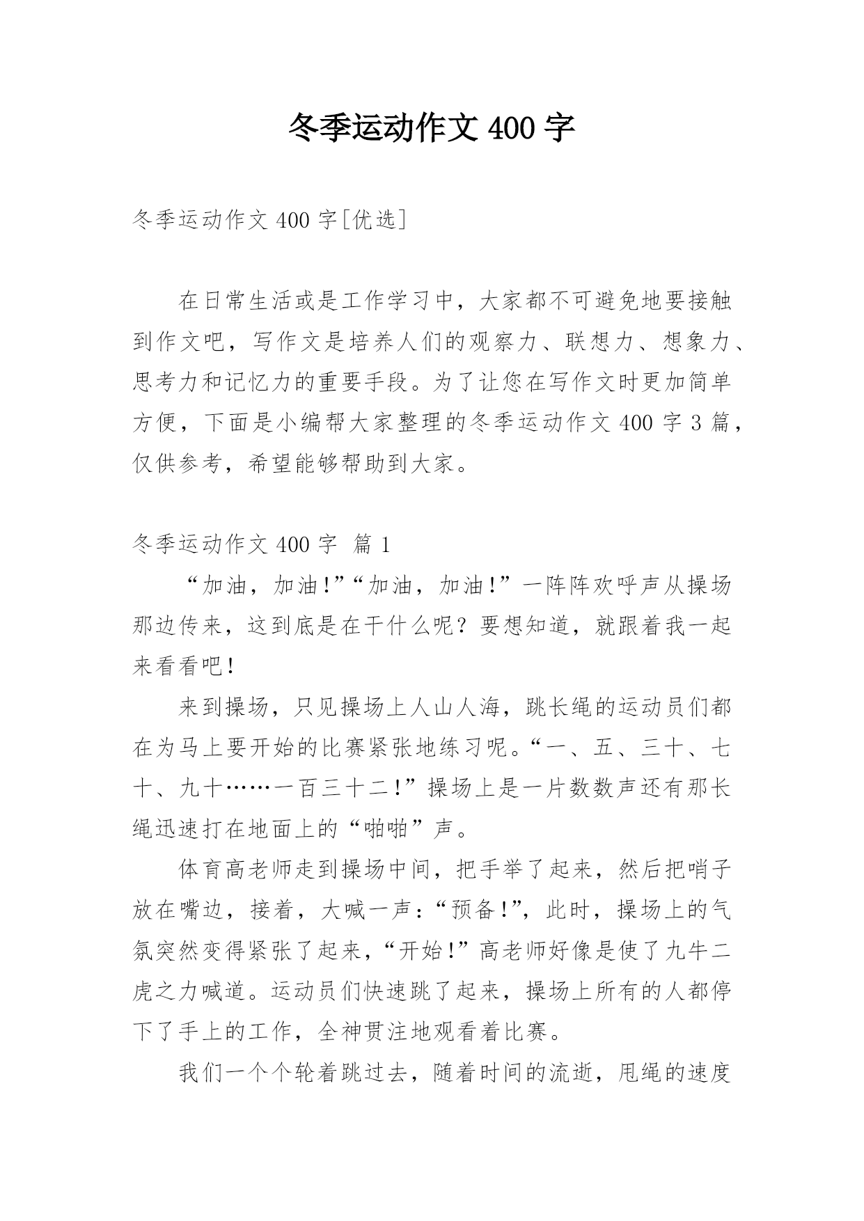 冬季运动作文400字冬季运动作文400字[优选]在日常生活或是工作学习中,大家都不可避免地要接触到作文吧,写作文是培养人们的观察力、联想力、想象力、思考力和记忆力的重要手段。为了让您在写作文时更加简单方便,下面是小编帮大家整理的冬季运动作文400字3篇,仅供参考,希望能够帮助到大家。冬季运动作文400字篇1“加油,加油!”“加油,加油!”一阵阵欢呼声从操场那边传来,这到底是在干什么呢?要想知道,就跟着我一起来看看吧!来到操场,只见操场上人山人海,跳长绳的运动员们都在为马上要开始的比赛紧张地练习呢。“一、五