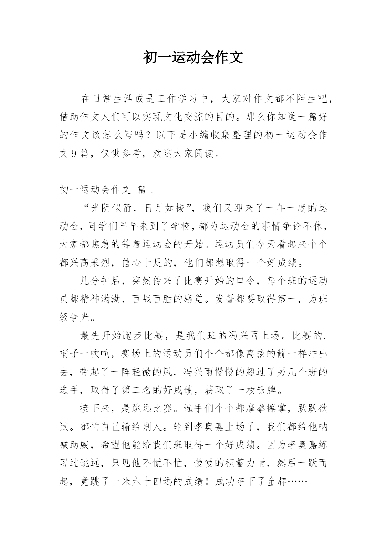 初一运动会作文在日常生活或是工作学习中,大家对作文都不陌生吧,借助作文人们可以实现文化交流的目的。那么你知道一篇好的作文该怎么写吗?以下是小编收集整理的初一运动会作文9篇,仅供参考,欢迎大家阅读。初一运动会作文篇1“光阴似箭,日月如梭”,我们又迎来了一年一度的运动会,同学们早早来到了学校,都为运动会的事情争论不休,大家都焦急的等着运动会的开始。运动员们今天看起来个个都兴高采烈,信心十足的,他们都想取得一个好成绩。几分钟后,突然传来了比赛开始的口令,每个班的运动员都精神满满,百战百胜的感觉。发誓都要取得第一