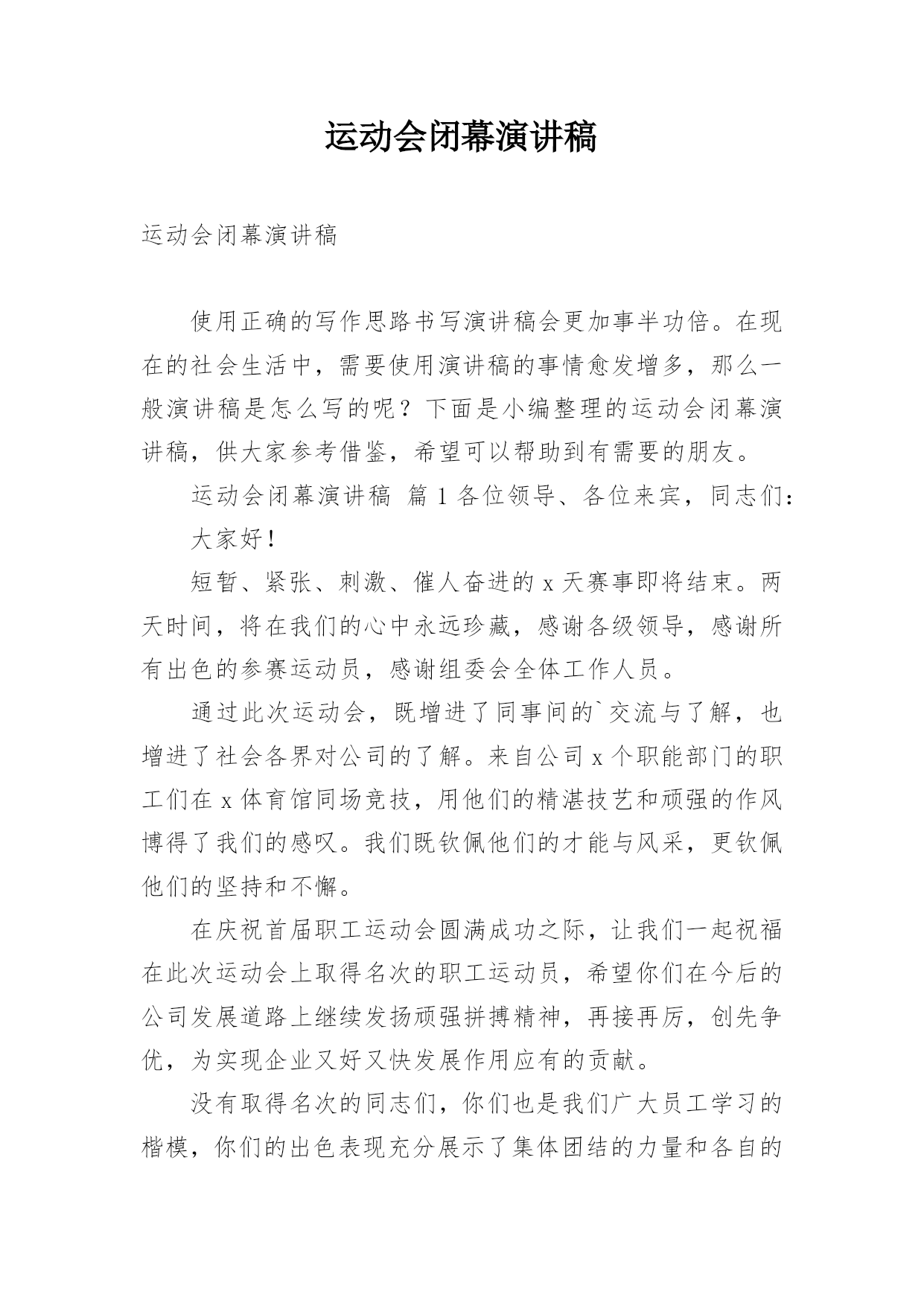 运动会闭幕演讲稿运动会闭幕演讲稿使用正确的写作思路书写演讲稿会更加事半功倍。在现在的社会生活中,需要使用演讲稿的事情愈发增多,那么一般演讲稿是怎么写的呢?下面是小编整理的运动会闭幕演讲稿,供大家参考借鉴,希望可以帮助到有需要的朋友。运动会闭幕演讲稿篇1各位领导、各位来宾,同志们:大家好!短暂、紧张、刺激、催人奋进的x天赛事即将结束。两天时间,将在我们的心中永远珍藏,感谢各级领导,感谢所有出色的参赛运动员,感谢组委会全体工作人员。通过此次运动会,既增进了同事间的`交流与了解,也增进了社会各界对公司的了解。来