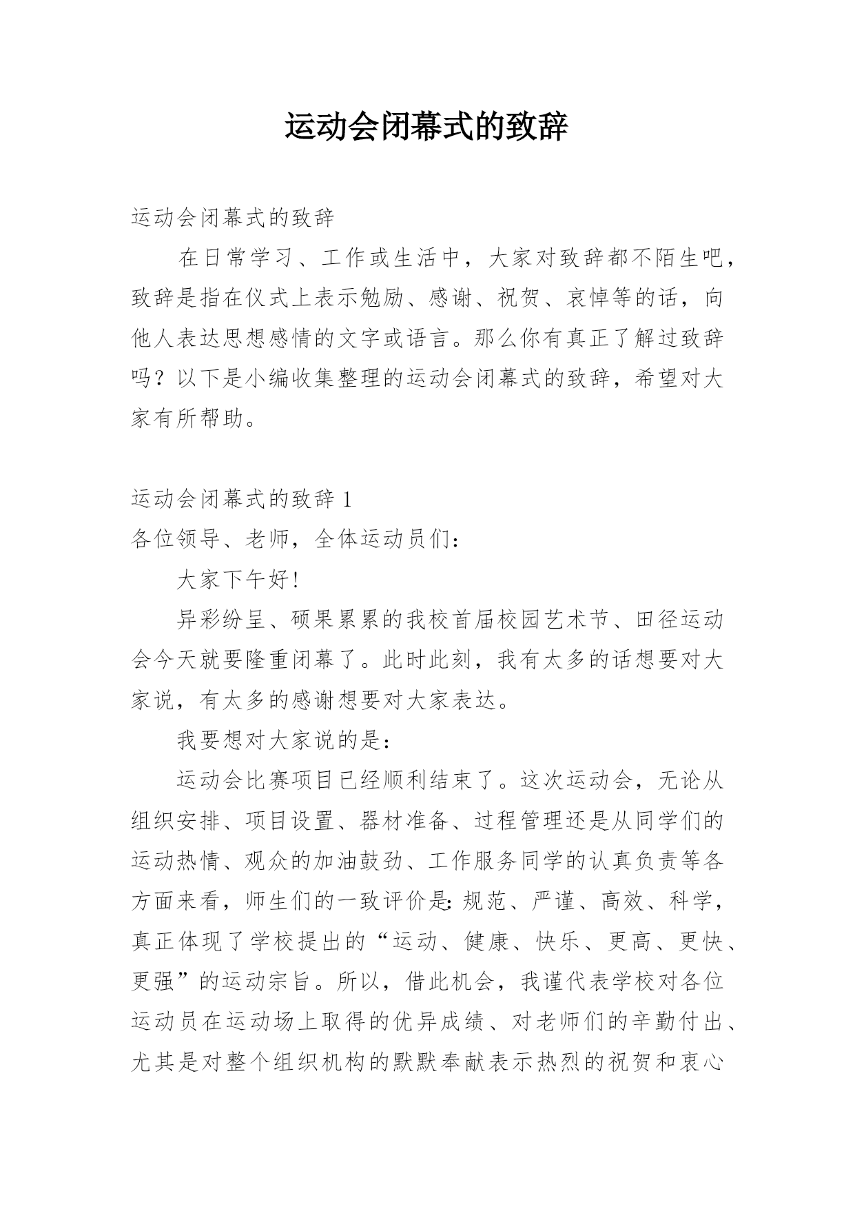 运动会闭幕式的致辞运动会闭幕式的致辞在日常学习、工作或生活中,大家对致辞都不陌生吧,致辞是指在仪式上表示勉励、感谢、祝贺、哀悼等的话,向他人表达思想感情的文字或语言。那么你有真正了解过致辞吗?以下是小编收集整理的运动会闭幕式的致辞,希望对大家有所帮助。运动会闭幕式的致辞1各位领导、老师,全体运动员们:大家下午好!异彩纷呈、硕果累累的我校首届校园艺术节、田径运动会今天就要隆重闭幕了。此时此刻,我有太多的话想要对大家说,有太多的感谢想要对大家表达。我要想对大家说的是:运动会比赛项目已经顺利结束了。这次运动会,